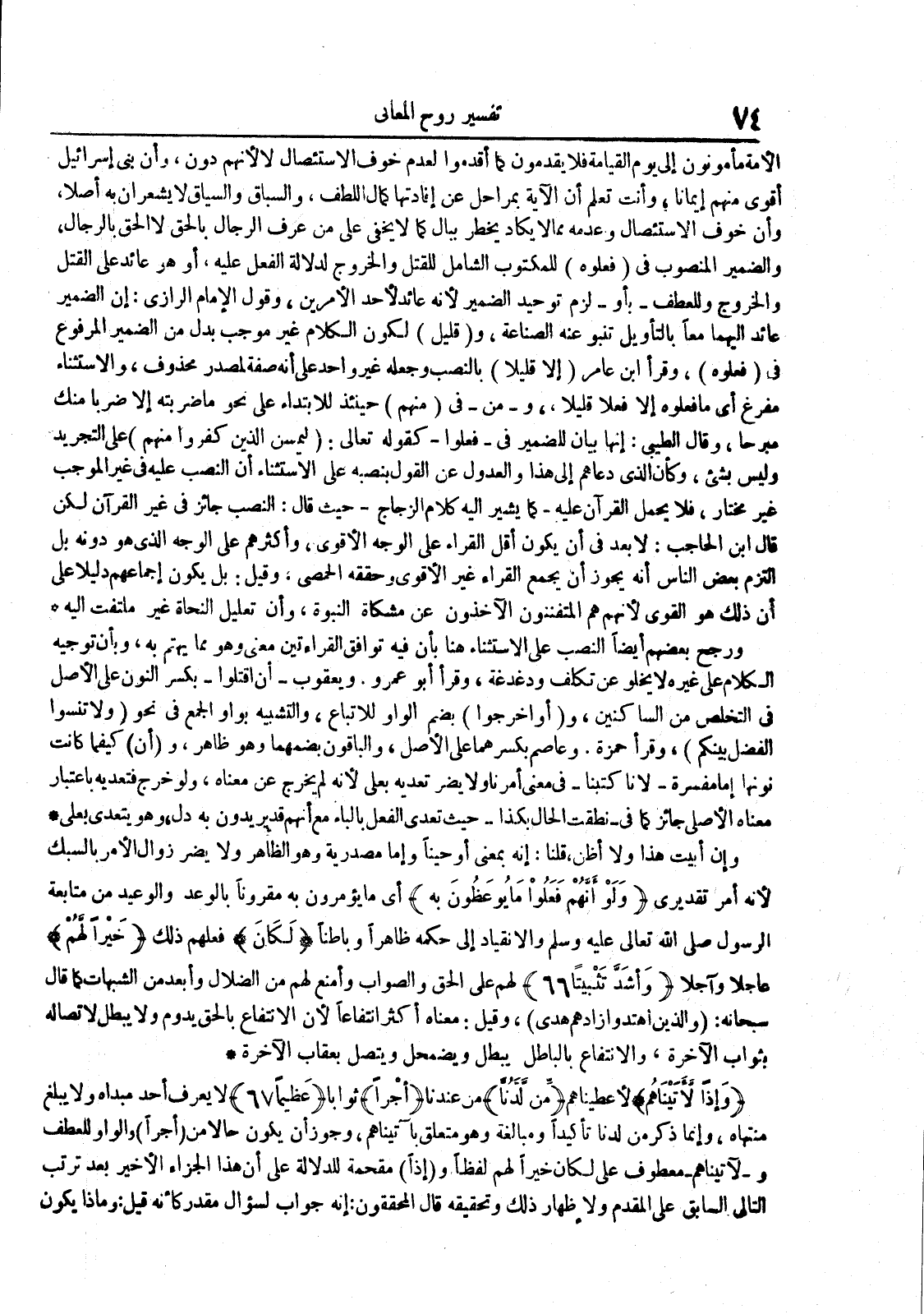 الأمة مأمونون إلى يوم القيامة فلا يقدمون كما أقدموا لعدم خوف الاستئصال لا لأنهم دون وأن بني أسرائيل أقوى منهم إيمانا وأنت تعلم أن الآية بمراحل على إفادتها كمال اللطف والسباق والسياق لا يشعران به أصلا وأن خوف الاستئصال وعدمه مما لا يكاد يخطر ببال كما لا يخفى على من عرف الرجال بالحق لا الحق بالرجال والضمير المنصوب في فعلوه للمكتوب الشامل للقتل والخروج لدلالة الفعل عليه أو هو عائد على القتل والخروج وللعطف بأو لزم توحيد الضمير لأنه عائد لأحد الأمرين وقول الإمام الرازي : إن الضمير عائد إليهما معا بالتأويل تنبو عنه الصناعة و قليل لكون الكلام غير موجب بدل من الضمير المرفوع في فعلوه وقرأ ابن عامر إلا قليلا بالنصب وجعله غير واحد على أنه صفة لمصدر محذوف والاستثناء مفرغ أي ما فعلوه إلا فعلا قليلا و من في منهم حينئذ للابتداء على نحو ما ضربته إلا ضربا منك مبرحا وقال الطيبي : إنها بيان للضمير في فعلوا كقوله تعالى : ليمسن الذين كفروا منهم على التجريد وليس بشئ وكأن الذي دعاهم إلى هذا والعدول عن القول بنصبه على الاستثناء أن النصب عليه في غير الموجب غير مختار فلا يحمل القرآن عليه كما يشير إليه كلام الزجاج حيث قال : النصب جائز في غير القرآن لكن قال ابن الحاجب : لا بعد في أن يكون أقل القراء على الوجه الأقوى وحققه الحمصي وقيل : بل يكون إجاعهم دليلا على أن ذلك هو القوي لأنهم هم المتفننون الآخذون عن مشكاة النبوة وأن تعليل النحاة غير ملتفت إليه