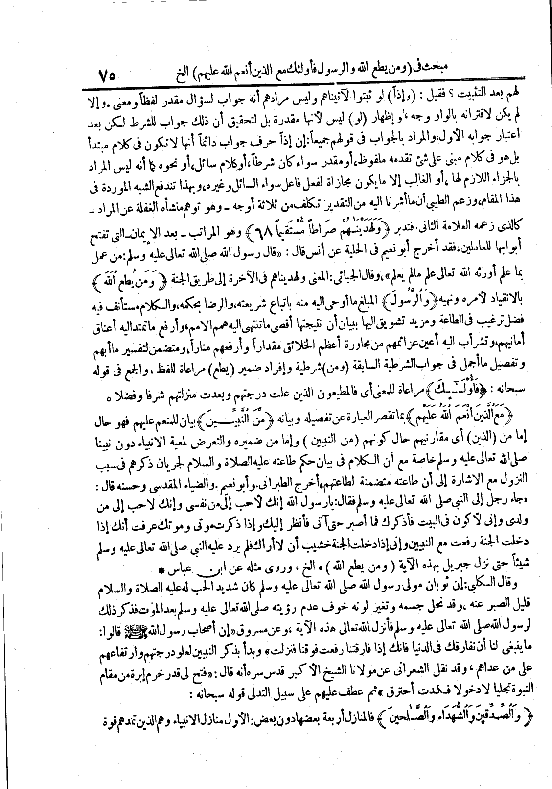 - وهو المراتب بعد الايمان التى تفتح أبوابها للعاملين فقد أخرج أبو نعيم فى الحيلة عن أنس قال : قال رسول الله صلى الله تعالى عليه وسلم : من عمل بما علم أورثه الله تعالى علم مالم يعلم وقال الجبائى : المعنى ولهديناهم فى الآخرة الى طريق الجنة ومن يطع الله بلانقياد لأمره ونهيه والرسول المبلغ مأوحى اليه منه باتباع شريعته والرضا بحكمه والكلام مستأنف فيه فضل ترغيب فى الطاعة ومزيد تشويق اليها ببيان أن نتيجتها أقصى ماتنتهى اليه همم الامم وأرفع ماتمتد اليه أعناق أمانيهم وتشرأب اليه أعين عزائمهم من مجاورة أعظم الخلائق مقدارا وأرفعهم منارا ومتضمن لتفسير ماأبهم وتفصيل ماأجمل فى جواب الشرطية السابقة ومن شرطية وإفراد ضمير يطع مراعاة للفظ والجمع فى قوله سبحانه : فأولك مراعاة للمعنى أى فالمطيعون الذين علت درجتهم وبعدت منزلتهم شرفا وفضلا