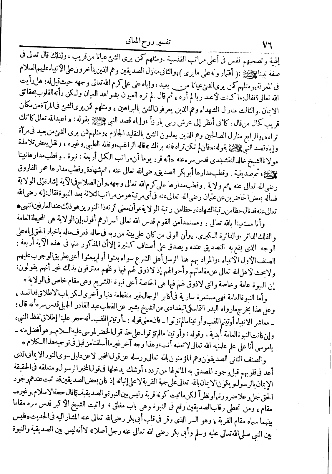إلهية وتصحبهم نفس فى أعلى مراتب القدسية ومثلهم كمن يرى الشىء عيانا من قريب ولذلك قال تعالى فى صفة نبينا صلى الله تعالى عليه وسلم : أفتمارونه على مايرى والثانى منازل الصديقين وهم الذين يتأخرون على الأنبياء عليهم السلام فى المعرفة ومثلهم كمن يرى الشىء عيانا من بعيد وإياه عنى على كرم الله وجهه حيث قيل له : هل رأيت الله تعالى فقال : ماكنت لأعبد ربا لم أره ثم قال لم تره العيون بشواهد العيان ولكن رأته القلوب بحقائق الايمان والثالث منازل الشهداء وهم الذين الشىء بالبراهين ومثلهم كمن يرى الشىء فى المرآة من مكان قريب كحال من قال : كأنى أنظر الى عرش ربى بارزا وإياه قصد النبى صلى الله تعالى عليه وسلم بقوله : اعبد الله كأنك تراه والرابع منازل الصالحين وهم الذين يعلمون الشىء بالتقليد الجازم ومثلهم كمن يرى الشىء من بعيد فى مرآة وإياه قصد النبى صلى الله تعالى عليه وسلم بقوله : فان لم تكن تراه فانه يراك قاله الراغب ونقله الطيبى وغيره ونقل بعض تلامذة مولانا الشيخ خالد النقشبندي قدس سره أنه قرر يوما أن مراتب الكمل أربعة : نبوة وقطب مدارها نبينا صلى الله تعالى عليه وسلم ثم صديقية وقطب مداراها أبو بكر الصديق رضى الله تعالى عنه ثم شهادة وقطب مدارها عمر الفاروق رضى الله تعالى عنه ثم ولاية وقطب مدارها على كرم الله تعالى وجهه وأن الصلاح فى الآية إشارة الى الولاية فسأله بعض الحاضرين عن عثمان رضي الله تعالى عنه في أي مرتبة هو من مراتب الثلاثة بعد النبوة فقال : ان رضى الله تعالى عنه قد نال حظا من رتبة الشهادة وحظا من رتبة الولاية وأن معنى كونه ذا النورين هو ذلك عند العارفين انتهى