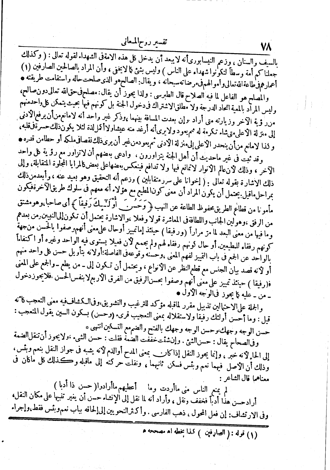 وقد ثبت في غير ما حديث أن أهل الجنة يتزاورون وادعى بعضهم أن لاتزاور مع رؤية كل واحد الآخر وذلك لأن عالم الانوار لاتمانع فيها ولاتدافع فينعكس بعضها على بعض كالمرايا المجلوة المتقابلة والى ذلك الاشارة الى قوله تعالى : اخوانا على سرر متقابلين وزعم أنه التحقيق وهو بعيد عنه وأبعد من ذلك بمراحل ماقيل : يحتمل أن يكون المراد أن معن ى كون المطيع مع هولاء أنه معهم فى سلوك طريق الآخرة فيكون مأمونا من قطاع الطريق محفوظ الطاعة عن النهب وحسن أولئك ذلك رفيقا أي صاحبا وهو مشتق من الرفق وهو لين الجانب واللطافة فى المعاشرة قولا وفعلا والاشارة يحتمل أن تكون الى النبيين ومن بعدهم ومافيها من معنى البعد لما مر مرارا ورفيقا حينئذ اما تمييز أو حال على معنى أنهم وصفو بالحسن من جهة كونهم رفقاء للمطيعين أو حال كونهم رفقاء لهم ولم يجمع لأن فعيلا يستوى فيه الواحد وغيره أو أكتفاءا بالواحد عن الجمع فى باب التمييز لفهم المعنى وحسنه وقوعه في الفاصلة أو لانه بتأويل حسن كل واحد منهم أو لأنه قصد بيان الجنس مع قطع النظر عن الأنواع ويحتمل أن تكون الى من يطع والجمع على المعنى ف رفيقا حينئذ تمييز على معنى أنهم وصفوا بحسن الرفيق من الفرق الأربع لابنفس الحسن فلا يجوز دخول من عليه كما يجوز في الوجه الأول