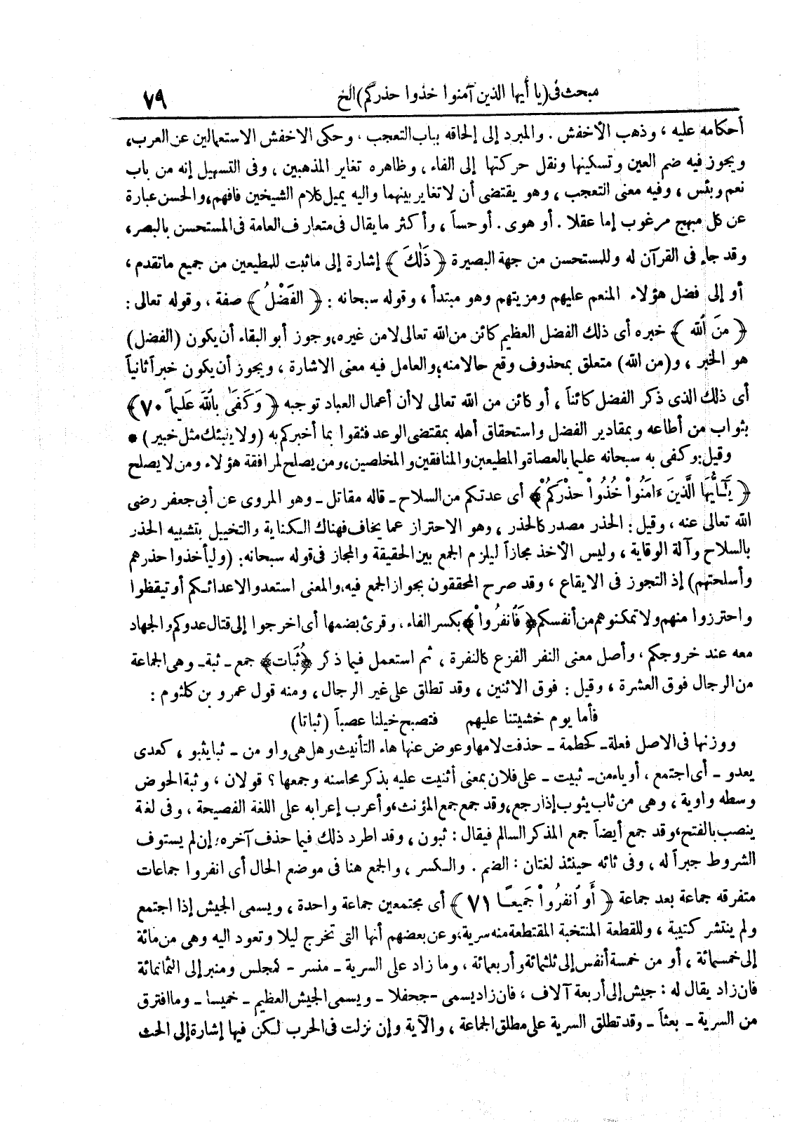 وقيل : وكفى به سبحانه عليما بالعصاة والمطيعين والمنافقين والمخلصين ومن يصلح لمرافقة هؤلاء ومن لايصلح ياايها الذين امنوا خذوا حذركم أي عدتكم من السلاح قاله مقاتل وهو المروى عن أبي جعفر رضر الله تعالى عنه وقيل : الحذر مصدر كالحذر وهو الاحتراز عما يخاف فهناك الكناية والتخييل بتشبيه الحذر بالسلاح وآلة الوقاية وليس الأخذ مجازا ليلزم الجمع بين الحقيقة والمجاز في قوله سبحانه : وليأخذو حذرهم وأسلحتهم اذ التجوز في الايقاع وقد صرح المحققون بجواز الجمع فيه والمعنى استعدوا فيه لاعدائكم أو تيقظوا واحترزوا منهم ولاتمكنوهم من أنفسكم فانفروا بكسر الفاء وقرىء بضمها أى اخرجوا الى قتال عدوكم والجهاد معه عند خروجكم وأصل معنى النفر الفزع كالنفرة ثم استعمل فيما ذكر ثبات جمع ثبة وهي الجماعة من الرجال فوق العشرة وقيل : فوق الاثنين وقد تطلق على غير الرجال ومنه قول عمرو بن كلثوم : فأما يوم خشيتنا عليهم فتصبح خيلنا عصبا ثباتا ووزنها في الاصل فعلة كحطمة حذفت لامها وعوض عنها هاء التأنيث وهل هي واو من ثبا يثبوا كعدى يعدو أي اجتمع أو ياء من ثبيت على فلان بمعنى أثنيت عليه بذكر محاسنه وجمعها قولان وثبة الحوض وسطه واوية وهي من ثاب يثوب اذا رجع وقد جمع جمع المؤنث وأعرب اعرابه على اللغة الفصيحة وفي لغة ينصب بالفتح وقد جمع أيضا جمع المذكر السالم فيقال : ثبون وقد اطرد ذلك فيما حذف آخره ان لم يستوف الشروط جبرا له وفي ثائه حينئذ لغتان : الضم والكسر والجمع هنا موضع الحال أي انفروا جماعات متفرقة جماعة بعد جماعة أو أنفروا جميعا