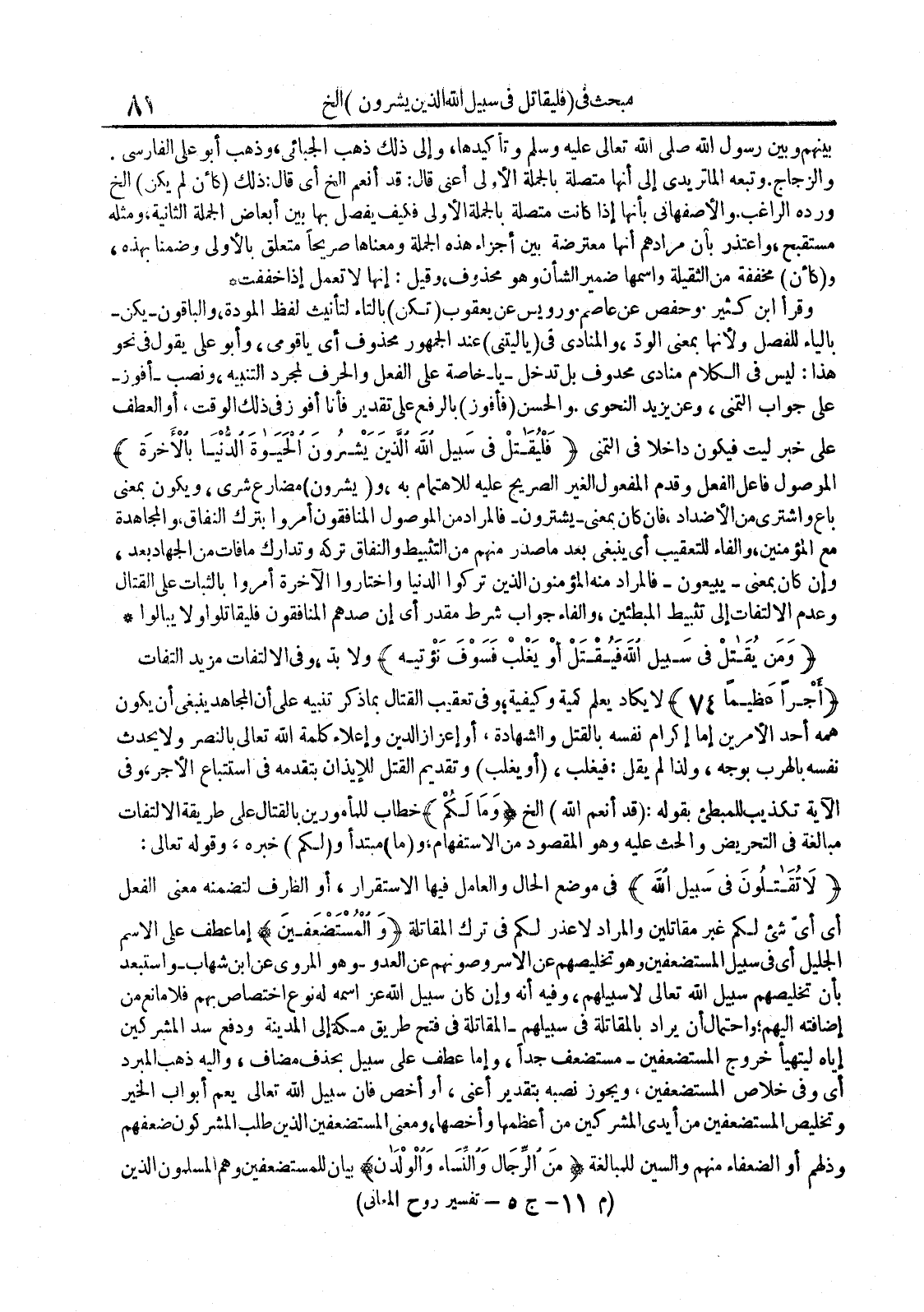 - لايكاد يعلم كمية وكيفية وفي تعقيب القتال بما ذكر تنبيه على أن المجاهد ينبغي أن يكون همه أحد الأمرين إما إكرام نفسه بالقتل والشهادة أو اعزاز الدين واعلاء كلمة الله تعالى بالنصر ولايحدث نفسه بالهرب بوجه ولذا لم يقل : فيغلب أو يغلب وتقديم القتل للايذان بتقدمه في استتباع الأجر وفي الآية تكذيب للمبطىء بقوله : قد أنعم الله الخ ومالكم خطاب للمأمورين بالقتال على طريقة الالتفات مبالغة في الحث والتحريض عليه وهو المقصود من الاستفهام و ما مبتدأ و لكم خبره وقوله تعالى : لاتقاتلون في سبيل الله في موضع الحال والعامل فيها الاستقرار أو الظرف لتضمنه معنى الفعل أى أى شىء لم غبر مقاتلين والمراد لاعذر لكم في ترك المقاتلة والمستضعفين اما عطف على الاسم الجليل أي في سبيل المستضعفين وهو تخليصهم عن الاسر وصونهم عن العدو وهو المروى عن ابن شهاب واستبعد بأن تخليصهم سبيل الله تعالى لاسبيلهم وفيه أنه وان كان سبيل الله عز اسمه له نوع اختصاص بهم فلامانع من اضافته اليهم : واحتمال ان يراد بالمقاتلة في سبيلهم المقاتلة في فتح طريق مكة الى المدينة ودفع سد المشركين اياه ليتهيأ خروج المستضعفين مستضعف جدا وإما عطف على سبيل بحذف مضاف واليه ذهب المبرد أي وفي خلاص المستضعفين ويجوزنصبه بتقدير أعنى أو أخص فان سبيل الله تعالى يعم أبواب الخير وتخليص المستضعفين من أيدي المشركين من أعظمها وأخصها ومعنلى المستضعفين الذين طلب المشركون ضعفهم وذلهم أو الضعفاء منهم والسين للمبالغة من الرجال والنساء والولدان بيان للمستضعفين وهم المسلمون الذين