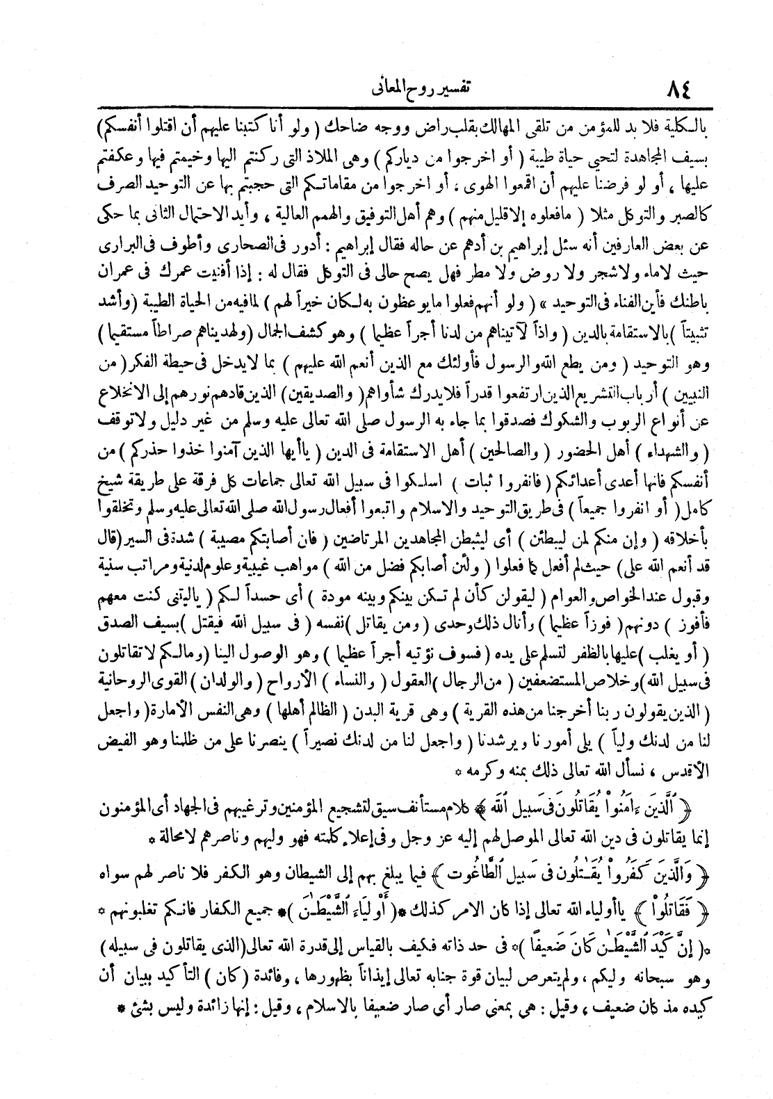 بالكلية فلابد للمؤمن من تلقي المهالك بقلب راضى ووجه ضاحك ولو أنا كتبنا عليهم أن اقتلوا أنفسكم بسيف المجاهدة لتحي حياة طيبة أو اخرجوا من دياركم وهي الملاذ التي ركنتم اليها وخيمتم فيها وعكفتم عليها أو لو فرضنا عليهم أن اقمعوا الهوى أو اخرجوا من مقاماتكم التي حجبتم بها عن التوحيد الصرف كالصبر والتوكل مثلا مافعلوه إلا قليلا منهم وهم أهل التوفيق والهمم العالية وأيد الاحتمال الثاني بما حكى عن بعض العارفين أنه سئل ابراهيم بن أدهم عن حاله فقال ابراهيم : أدور في الصحارى وأطوف في البراري حيث لاماء ولاشجر ولاروض ولامطر فهل يصح حالي في التوكل فقال له : اذا أفنيت عمرك في عمران بطنك فأين الفناء في التوحيد ولو أنهم فعلوا مايوعظون به لكان خيرا لهم لما فيه من الحياة الطيبة وأشد تثبيتا بالاستقامة بالدين واذا لآتيناهم من لدنا أجرا عظيما وهو كشف الجمال ولهديناهم صراطا مستقيما وهو التوحيد ومن يطع الله والرسول قأولئك مع الذين أنعم الله عليهم بما لايدخل في حيطة الفكر من النبيين أرباب التشريع الذين ارتفعوا قدرا فلا يدرك شأواهم والصديقين الذين قادهم نورهم الى الانخلاع عن أنواع الربوب والشكوك فصدقوا بما جاء به الرسول من غير دليل ولاتوقف والشهداء أهل الحضور والصالحين أهل الاستقامة في الدين يأيها الذين آمنوا خذوا حذركم من أنفسكم فانها أعدى أعدائكم فانفروا ثبات اسلكوا في سبيل الله جماعات كل فرقة على طريق شيخ كامل أو انفروا جميعا في طريق التوحيد والاسلام واتبعوا أفعال رسول اله وتخلقوا بأخلاقه وان منكم لمن يبطئن أ ي ليبطئن المجاهدين المرتاضين فان أصابتك مصيبة شدة في السير قال قد أنعم الله على حيث لم أفعل كما فعلوا ولئن أصابكم فضل من الله مواهب غيبية وعلوم لدنية ومراتب سنية وقبول عند الخواص والعوام ليقولن كأن لم تكن بينكم وبينه مودة أي حسدا لكم ياليتني كنت معهم فأفوز دونهم فوزا عظيما وأنال ذلك وحدي ومن يقاتل نفسه في سبيل الله فيقتل بسيف الصدق أو يغلب عليها بالظفر لتسلم على يده فسوف نؤتيه أجرا عظيما وهو الوصول الينا ومالكم لاتقاتلون في سبيل الله وخلاص المستضعفين من الرجال العقول والنساء الارواح والولدان القوى الروحانية الذين يقولون ربنا أخرجنا من هذه القرية وهي قرية البدن الظالم أهلها وهي النفس الامارة واجعل لنا من لدنك نصيرا ينصرنا على من ظلمنا وهو الفيض الأقدس نسأل الله تهالى ذلك بمنه وكرمه