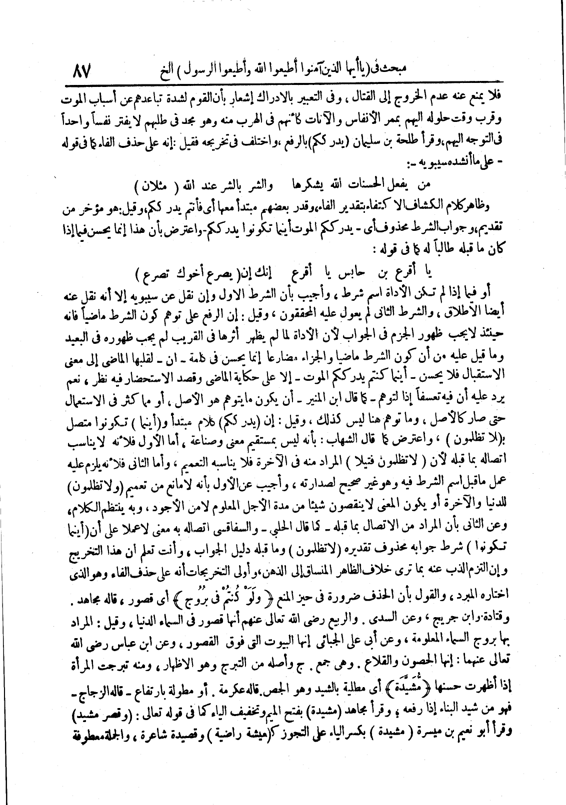فلا يمنع عنه الخروج الى القتال وفي التعبير بالادراك إشعار بأن القوم لشدة تباعدهم عن أسباب الموت وقرب وقت حلوله اليهم بممر الانفاس والآنات كأنهم في الهرب منه وهو مجد في طلبهم لايفتر نفسا واحدا في التوجه اليهم وقرأ طلحة بن سليمان يدرككم بالرفع واختلف في تخريجه فقيل : إنه على حذف الفاء كما في قوله على ما أنشده سيبويه : من يفعل الحسنات الله يشكرها والشر بالشر عند الله مثلان وظاهر كلام الكشاف الاكتفاء بتقدير الفاء وقدر بعضهم مبتدأ معها أى فأنتم يدرككم وقيل : هو مؤخر من تقديم وجواب الشرط محذوف أى يدرككم الموت أينما تكونوا يدرككم واعترض بأن هذا انما يحسن فيما إذا كان ماقبله طالبا له كما في قوله : يا أقرع بن حابس يا أقرع إنك إن يصرع أخوك تصرع أو فيما إذا لم تكن الأداة اسم شرط وأجيب بأن الشرط الاول وإن نقل عن سيبويه إلا أنه نقل عنه أيضا الاطلاق والشرط الثاني لم يعول عليه المحققون وقيل : إن الرفع على توهم كون الشرط ماضيا فانه حينئذ لايجب ظهور الجزم في الجواب لأن الاداة لما لم يظهر أثرها في القريب لم يجب ظهوره في البعيد وماقيل عليه من أن الشرط ماضيا والجزاء مضارعا انما يحسن في كلمة ان لقلبها الماضي الى معنى الاستقبال فلا يحسن أينما كنتم يدرككم الموت الا على حكاية الماضي وقصد الاستحضار فيه نظر نعم يرد عليه أن فيه تعسفا اذا لتوهم كما قال ابن المنير أن يكون مايتوهم هو الأصل أو مما كثر في الاستعمال حتى صار كالأصل وما توهم هنا ليس كذلك وقيل : إن يدرككم كلام مبتدأ و أينما تكونوا متصل ب لاتظلمون واعترض كما قال الشهاب : بأنه ليس بمستقيم معنى وصناعة أما الأول فلأنه لايناسب اتصاله بما قبله لأن لاتظلمون فتيلا المراد منه في الآخرة فلا يناسبه التعميم وأما الثاني فلأنه يلزم عليه عمل ماقبل اسم الشرط فيه وهو غير صحيح لصدارته وأجيب عن الاول بأنه لامانع من تعميم ولاتظلمون للدنيا والآخرة أو يكون المعنى لاينقصون شيئا من مدة الأجل المعلوم لامن الأجود وبه ينتظم الكلام وعن الثاني بأن المراد من الاتصال بما قبله كما قال الحلبي والسفاقسي اتصاله به معنى لاعملا على أن أينما تكنوا شرط جوابه محذوف تقديره لاتظلمون وماقبله دليل الجواب وأنت تعلم أن هذا التخريج وإن التزم الذب عنه بما ترى خلاف الظاهر المنساق الى الذهن وأولى التخريجات أنه على حذف الفاء وهو الذي اختاره المبرد والقول بأن الحذف ضرورة في حيز المنع ولو كنتم في بروج أي قصور قاله مجاهد وقتادة وابن جريج وعن السدى والربيع رضي الله تعالى عنهم أنها قصور في السماء الدنيا وقيل : المراد بها بروج السماء المعلومة وعن أبي على الجبائى انها البيوت التي فوق القصور وعن ابن عباس رضي الله تعالى عنهما : انها الحصون والقلاع وهي جمع ج وأصله من التبرج وهو الاظهار ومنه تبرجت المرأة اذا أظهرت حسنها مشيدة أي مطلية بالشيد وهو الجص قاله عكرمة أو مطولة بارتفاع قاله الزجاج فهو من شيد البناء اذا رفعه وقرأ مجاهد مشيدة بفتح الميم وتخفيف الياء كما في قوله تعالى : وقصر مشيد وقرأ أبو نعيم بن ميسرة مشيدة بكسر الياء على التجوز ك عيشة راضية وقصيدة شاعرة والجملة المعطوفة