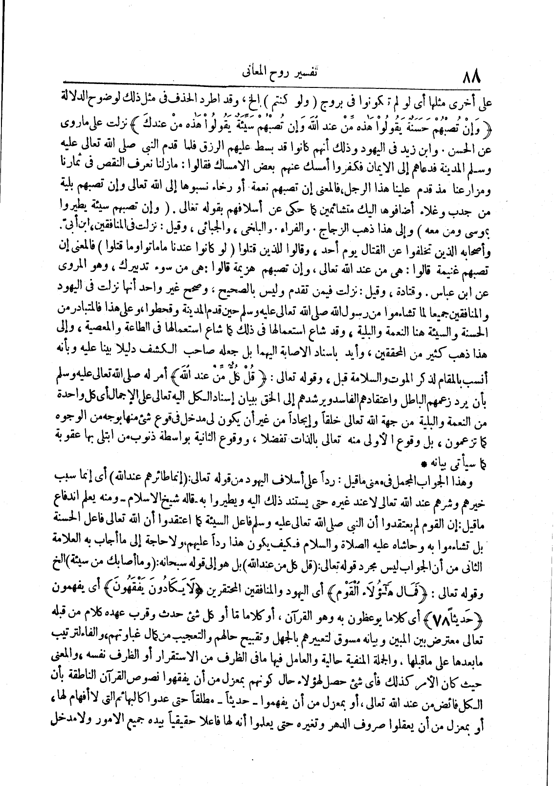 على أخرى مثلها أى لو لم تكونوا في بروج ولو كنتم الخ وقد اطرد الحذف في مثل ذلك لوضوح الدلالة وإن تصبهم حسنة يقولوا هذه من عند الله وان تصبهم سيئة يقولوا هذه من عندك نزلت على ماروى عن الحسن وابن زيد في اليهود وذلك انهم كانوا قد بسط عليهم الرزق فلما قدم النبي صلى الله عليه و سلم المدينة فدعاهم الى الايمان فكفروا أمسك عنهم بعض الامساك فقالوا : مازلنا نعرف النقص في ثمارنا ومزارعنا مذ قدم علينا هذا الرجل فالمعنى إن تصبهم نعمة أو رخاء نسبوها الى الله تعالى وإن تصبهم بلية من جدب وغلاء أضافوها اليك متشائمين كما حكي عن أسلافهم بقوله تعالى وان تصبهم سيئة يطيروا بموسى ومن معه والى هذا ذهب الزجاج والفراء والبلخي والجبائي وقيل نزلت في المنافقين ابن أبى وأصحابه الذين تخلفوا عن القتال يوم أحد وقالوا للذين قتلوا لو كانوا عندنا ماماتوا وما قتلوا فالمعنى ان تصبهم غنيمة قالوا : هي من عند الله تعالى وان تصبهم هزيمة قالوا : هي من سوء تدبيرك وهو المروى عن ابن عباس وقتادة وقيل : نزلت فيمن تقدم وليس بالصحيح وصحح غير واحد أنها نزلت في اليهود والمنافقين جميعا لما تشاءموا من رسول الله صلى الله عليه و سلم حين قدم المدينة وقحطوا وعلى هذا فالمتبادر من الحسنة والسيئة هنا النعمة والبلية وقد شاع استعمالها في الطاعة والمعصية والى هذا ذهب كثير من المحققين وأيد باسناد الاصابة اليهما بل جعله صاحب الكشف دليلا بينا عليه وبأنه أنسب بالمقام لذكر الموت والسلامة قبل وقوله تعالى قل كل من عند الله أمر له صلى الله عليه و سلم بأن يرد زعمهم الباطل واعتقادهم الفاسد ويرشدهم إلى الحق ببيان إسناد الكل اليه تعالى على الإجمال أي كل واحدة من النعمة والبلية من جهة الله تعالى خلقا وايجادا من غير ان يكون لي مدخل في قوع شىء منها بوجه من الوجوه كما تزعمون بل وقوع الأولى منه تعالى بالذات تفضلا ووقوع الثانية بواسطة ذنوب من ابتلى بها عقوبة كما سيأتي بيانه