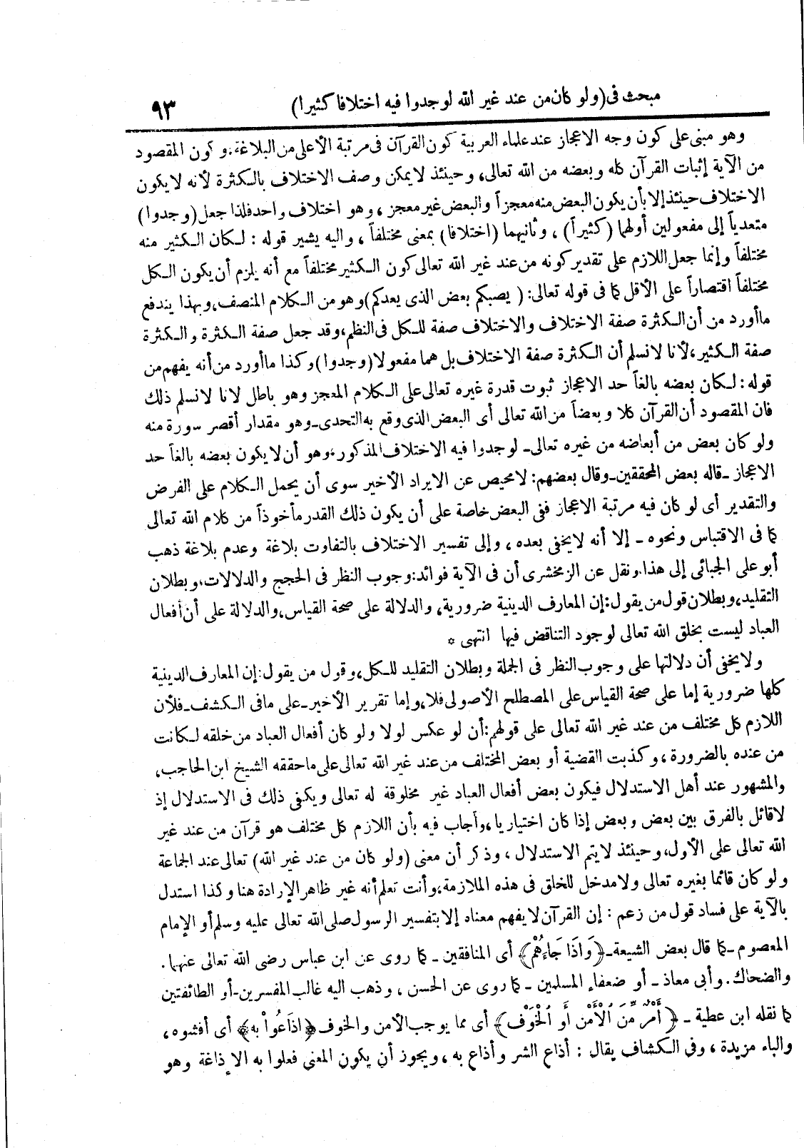 وهو مبني على كون وجه الاعجاز عند علماء العربية كون القرآن في مرتبة الأعلى من البلاغة وكون المقصود من الآية اثبات القرآن كله وبعضه من الله تعالى وحينئذ لايمكن وصف الاختلاف بالكثرة لأنه لايكون الاختلاف حينئذ الا بأن يكون البعض منه معجزا والبعض غير معجز وهو اختلاف واحد فلذا جعل وجدوا متعديا الى مفعولين أولهما كثيرا وثانيهما اختلافا بمعنى مختلفا واليه يشير قوله : لكان الكثير منه مختلفا وإنما جعل اللازم على تقدير كونه من عند غير الله تعالى كون الكثير مختلفا مع أنه يلزم أن يكون الكل مختلفا اقتصارا على الأقل كما في قوله تعالى : يصبكم بعض الذي يعدكم وهو من الكلام المنصف وبهذا يندفع مأورد من أن الكثرة صفة الاختلاف والاختلاف صفة للكل في النظم وقد جعل صفة الكثرة والكثرة صفة الكثير لأنا لانسلم أن الكثرة صفة الاختلاف بل هما مفعولا وجدوا وكذا ماأورد من أنه يفهم من قوله : لكان بعضه بالغا حد الاعجاز ثبوت قدرة غيره تعالى على الكلام المعجز وهو باطل لانا لانسلم ذلك فان المقصود أن القرآن كلا وبعضا من الله تعالى أى البعض الذي وقع به التحدى وهو مقدار أقص سورة منه ولو كان بعض من أبعاضه من غيره تعالى لوجدوا فيه الاختلاف المذكور وهو أن لايكون بعضه بالغا حد الاعجاز قاله بعض المحققين وقال بعضهم : لامحيص عن الايراد الأخير سوى أن يحمل الكلام على الفرض والتقدير أى لوكان فيه مرتبة الاعجاز ففى البعض خاصة على أن يكون ذلك القدر مأخوذا من كلام الله تعالى كما في الاقتباس ونحوه إلا أنه لايخفى بعده والى تفسير الاختلاف بالتفاوت بلاغة وعدم بلاغة ذهب أبو على الجبائى الى هذا ونقل عن الزمخشرى أن فى الآية فوائد : وجوب النظر في الحجج والدلالات وبطلان التقليد وبطلان قول من يقول : إن المعارف الدينية ضرورية والدلالة على صحة القياس والدلالة على أن أفعال العباد ليست بخلق الله تعالى لوجود التناقض فيها انتهى