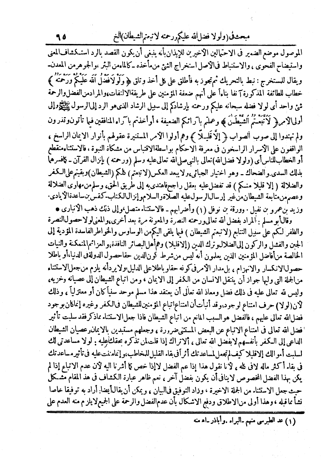 وقال أبو مسلم : المراد بفضل الله ورحمته النصرة والمعونة مرة بعد أخرى والمعنى لولا حصول النصرة والظفر لكم على سبيل التتابع لاتبعتم الشيطان فيما يلقى اليكم من الوساوس والخواطر المؤدية الى الجبن والفشل والركون الى الضلال وترك الدين إلاقليلا وهم من أهل البصائر النافذة والعزائم المتمكنة والنيات الخالصة من أفاضل المؤمنين الذين يعلمون أنه ليس شرط كون الدين حقا حصول الدولة في الدنيا أو باطلا حصول الانكسار والانهزام بل مدار الأمر فى كونه حقا وباطلا على الدليل ولايرد أنه يلزم من جعل الاستثناء من الجملة التى وليها جواز أن ينتقل الانسان من الكفر الى الايمان ومن اتباع الشيطان الى ععصيانه وخزيه وليس لله تعالى عليه في ذلك فضل ومعاذ الله تعالى أن يعتقد هذا مسلم موحد سنيا كان أو معتزليا وذلك لأن لولا حرف امتناع لوجود وقد أنبأت أن امتناع اتباع المؤمنين للشيطان فى الكفر وغيره إنما كان بفضل الله تعالى عليهم فالفضل هو السبب المانع من اتباع الشيطان فاذا حعل الاستثناء مماذكر فقد سلبت تأثير فضل الله تعالى فى امتناع الاتباع عن البعض المستثنى ضرورة وجعلهم مستبدين بالايمان وعصيان الشيطان الداعى الى الكفر بأنفسهم لابفضل الله تعالى ألا تراك اذا قلت لمن تذكره بحقك عليه : لولا مساعدتى لك لسلبت أموالك إلا قليلا كيف تجعل لمساعدتك أثرا في بقاء القليل للمخاطب وانما مننت عليه فى تأثير مساعدتك في أكثر من ماله لا فى كله لأنا نقول هذا إذا عم اتلفضل لا إذا خص كما أشرنا اليه لأن عدم الاتباع إذا لم يكن بهذا الفضل المخصوص لاينافى أن يكون بفضل آخر نعم ظاهر عبارة الكشاف فى هذا المقام مشكل حيث جعل الاستثناء من الجملة الاخيرة وزاد التوفيق فى البيان ويمكن أن يقال أيضا : أراد به توفيقا خاصا نشأ مما قبله وهذا أولى من الاطلاق ودفع الاشكال بان عدم الفضل والرحمة على الجميع لايلزم منه العدم على