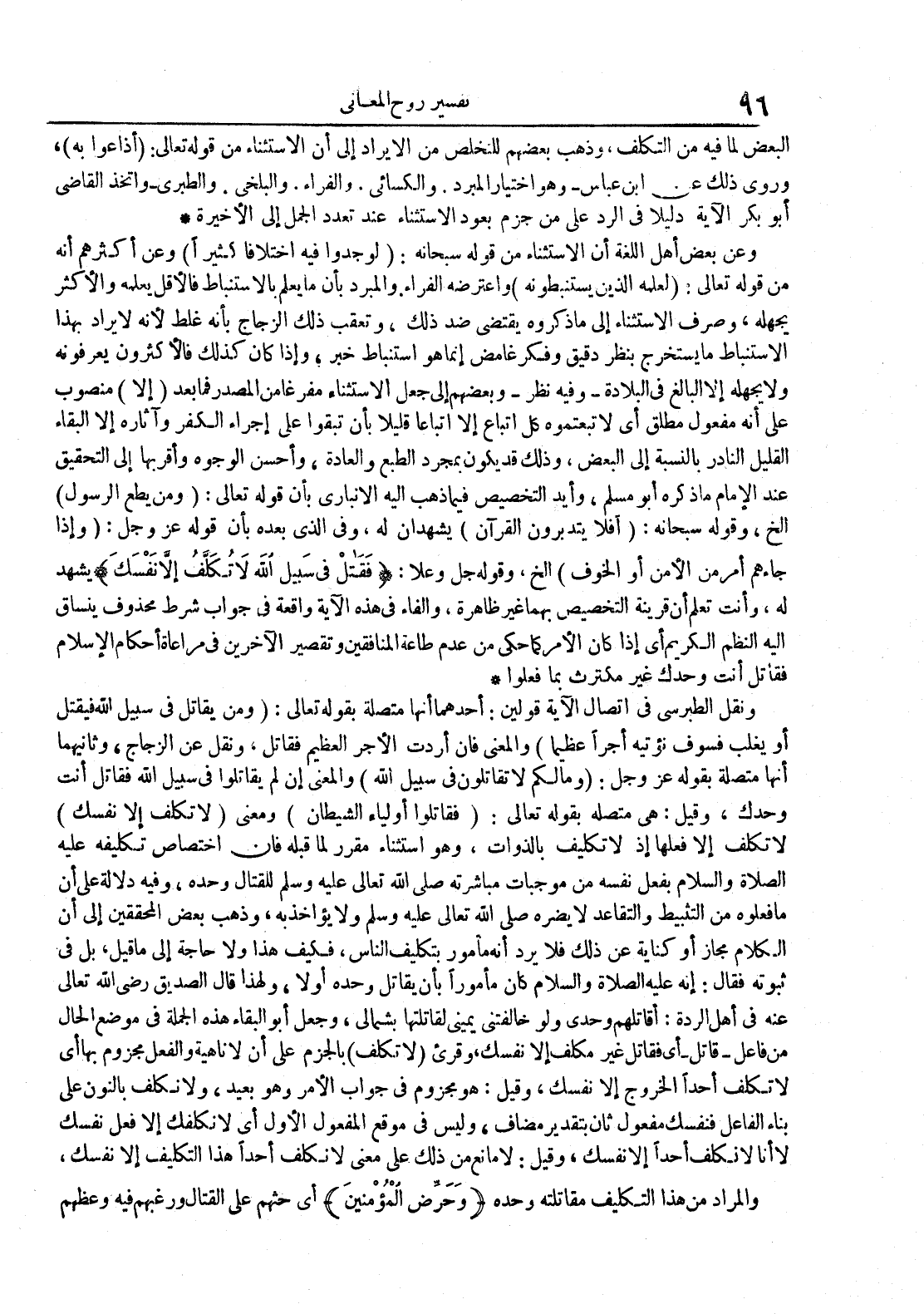 وعن بعض أهل اللغة أن الاستثناء من قوله سبحانه : لوجدوا فيه اختلافا كثيرا وعن أكثرهم أنه من قوله تعالى لعلمه الذين يستنبطونه واعترضه الفراء والمبرد بأن مايعلم بالاستنباط فالأقل يعلمه والأكثر يجهله وصرف الاستثناء الى ماذكروه يقتضى ضد ذلك وتعقب ذلك الزجاج بانه غلط لأنه لايراد بهذا الاستنباط مايستخرج بنظر دقيق وفكر غامض انما هو استنباط خبر وإذا كان ذلك فالأكثرون يعرفونه ولايجهله الا البالغ في البلادة وفيه نظر وبعضهم الى جعل الاستثناء مفرغا من المصدر فما بعد إلا منصوب على أنه مفعول مطلق أى لاتبعتموه كل اتباع إلا اتباعا قليلا بأن تبقوا على إجراء الكفر وآثاره إلا البقاء القليل النادر بالنسبة إلى البعض وذلك قد يكون بمجرد الطبع والعادة وأحسن الوجوه وأقربها الى التحقيق عند الإمام ماذكره أبو مسلم وأيد التخصيص فيما ذهب اليه الانبارى بأن قوله تعالى : ومن يطع الرسول الخ وقوله سبحانه : أفلا يتدبرون القرآن يشهدان له وفى الذى بعده بأن قوله عز و جل : وإذا جاءهم أمر من الأمن أوالخوف الخ وقوله جلا وعلا فقاتل في سبيل الله لاتكلف إلا نفسك يشهد له وأنت تعلم أن قرينة التخصيص بهما غير ظاهرة والفاء في هذه الآية واقعة في جواب شرط محذوف ينساق اليه نظم الكريم أى اذا كان الأمر كما حكى من عدم طاعة المنافقين وتقصير الآخرين في مراعاة أحكام الاسلام فقاتل أنت وحدك غير مكترث بما فعلوا