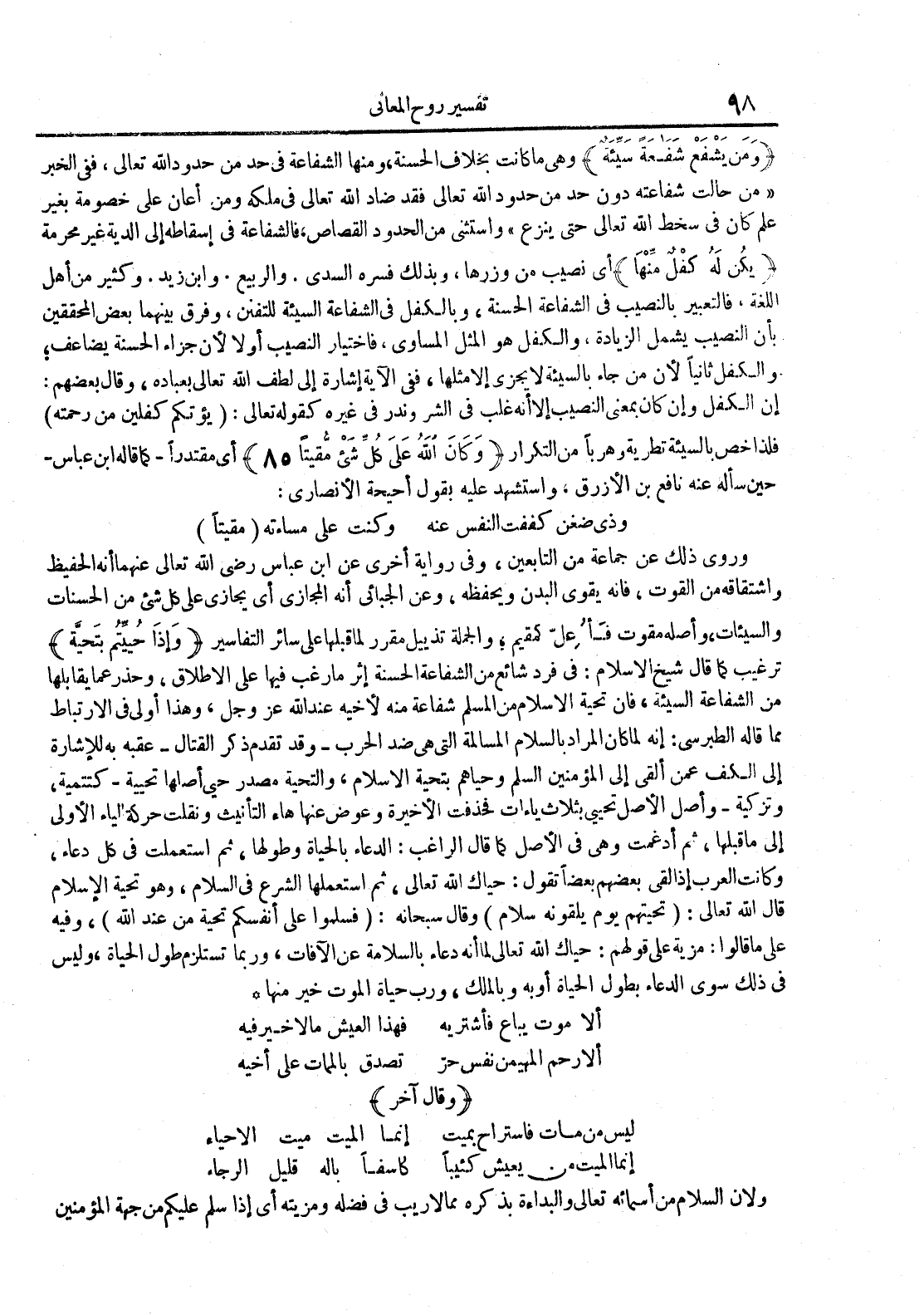 - أى مقتدرا كما قاله ابن عباس حين سأله عنه نافع بن الأزرق واستشهد عليه بقول أحيحة الأنصاري : وذى ضغن كففت النفس عنه وكنت على مساءته مقيتا وروى ذلك عن جماعة من التابعين وفى رواية أخرى عن ابن عباس رضى الله عنهما أنه لحفيظ واشتقاقه من القوت فانه يقى البدن ويحفظه وعن الجبائى انه المجازى أى يجازى على كل شىء من الحسنات والسيئات وأصله مقوت فأ عل كمقيم والجملة تذييل مقرر لما قبلها على سائر التفاسير وإذا حييتم بتحية ترغيب كما قال شيخ الاسلام : فى فرد شائع من الشفاعة الحسنة إثر مارغب فيها على الاطلاق وحذر عما يقابلها من الشفاعة السيئة فان تحية الاسلام من المسلم شفاعة منه لأخيه عند الله عز و جل وهذا أولى فى الارتباط مما قاله الطبرسى : انه لما كان المراد بالسلام المسالمة التى هى ضد الحرب وقد تقدم ذكر القتال عقبه به للإشارة الى الكف عمن ألقى الى المؤمنين السلم وحياهم بتحية الاسلام والتحية مصدر حى أصلها تحيية كتتمية وتزكية وأصل الأصل تحيي بثلاث ياءات فحذفت الأخيرة وعوض عنها هاء التأنيث ونقلت حركة الياء الأولى الى ماقبلها ثم أدغمت وهي في الأصل كما قال الراغب : الدعاء بالحياة وطولها ثم استعملت فى كل دعاء وكانت العرب إذا لقى بعضهم بعضا تقول : حياك الله تعالى ثم استعملها الشرع في السلام وهو تحية الإسلام قال الله تعالى : تحيتهم يوم يلقونه سلام وقال سبحانه : فسلموا على أنفسكم تحية من عند الله وفيه على ماقالوا : مزية على قولهم : حياك الله تعالى لما أنه دعاء بالسلامة عن الآفات وربما تستلزم طول الحياة وليس فى ذلك سوى الدعاء بطول الحياة أوبه وبالملك ورب حياة الموت خير منها