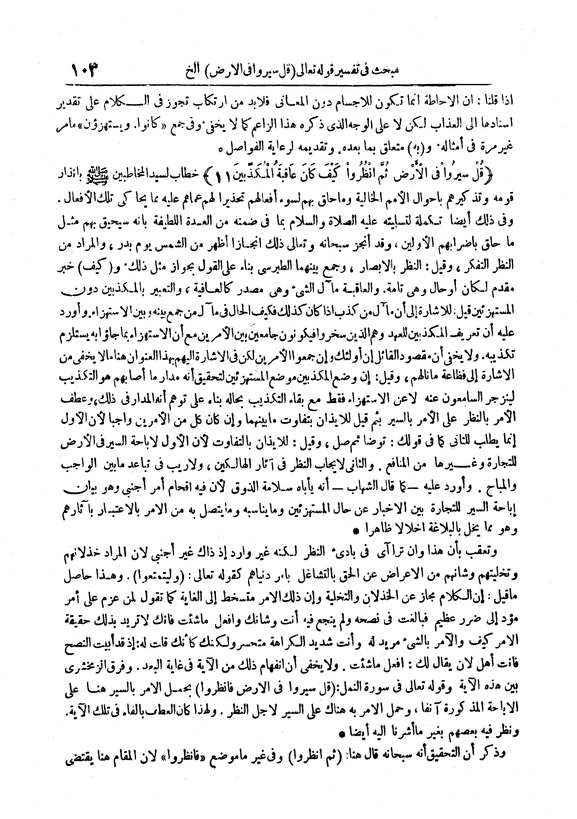 - خطاب لسيد المخاطبين صلى الله عليه و سلم وانذار قومه وتذكيرهم بأحوال الأمم الخالية وما حاق بهم لسوء أفعالهم تحذيرا لهم هما هم عليه مما يحاكي تلك الافعال وفي ذلك أيضا تكملة لتسليته عليه الصلاة و السلام بما في ضمنه من العدة اللطيفة بانه سيحيق بهم مثل ما حاق باضرابهم الأولين وقد أنجز سبحانه وتعالى ذلك إنجازا أظهر من الشمس يوم بدر والمراد من النظر التفكر وقيل : النظر بالابصار وجمع بينهما الطبرسي بناء على القول بجواز مثل ذلك و كيف خبر مقدم لكان أو حال وهي تامة والعاقبة مآل لشيء وهي مصدر كالعافية والتعبير بالمكذبين دون المستهزئين قيل : للاشارة إلى أن مآل من كذب إذا كان كذلك فكيف الحال في مآل من جمع بينه وبين الاستهزاء وأورد عليه أن تعريف المكذبين للعهد وهم الذين سخروا فيكونون جامعين بين الأمرين مع أن الاستهزاء بما جاؤا به يستلزم تكذيبه ولا يخفى أن مقصود القائل إن أولئك وإن جمعوا الأمرين لكن في الاشارة اليهم بهذا العنوان هنا ما لا يخفى من الاشارة إلى فضاعة ما نالهم وقيل : إن وضع المكذبين موضع المستهزئين لتحقيق أنه مدار أصابهم هو التكذيب لينزجر السامعون عنه لا عن الاستهزاء فقط مع بقاء التكذيب بحاله بناء على توهم أنه المدار في ذلك وعطف الأمر بالنظر على الأمر بالسير بثم قيل للايذان بتفاوت ما بينهما وإن كان كل من الأمرين واجبا لأن الأول إنما يطلب الثاني كما في قولك : توضأ ثم صل وقيل : للايذان بالتفاوت لأن الأول لاباحة السير في الأرض للتجارة وغيرها من المنافع والثاني لايجاب النظر في آثار الهالكين ولا ريب في تباعد مابين الواجب والمباح وأورد عليه كما قال الشهاب أنه يأباه سلامة لذوق لأن فيه اقحام أمر أجنبي وهو بيان إباحة السير للتجارة بين الاخبار عن حال المستهزئين وما يناسبه وما يتصل به من الأمر بالاعتبار بآثارهم وهو مما يخل بالبلاغة اخلالا ظاهرا