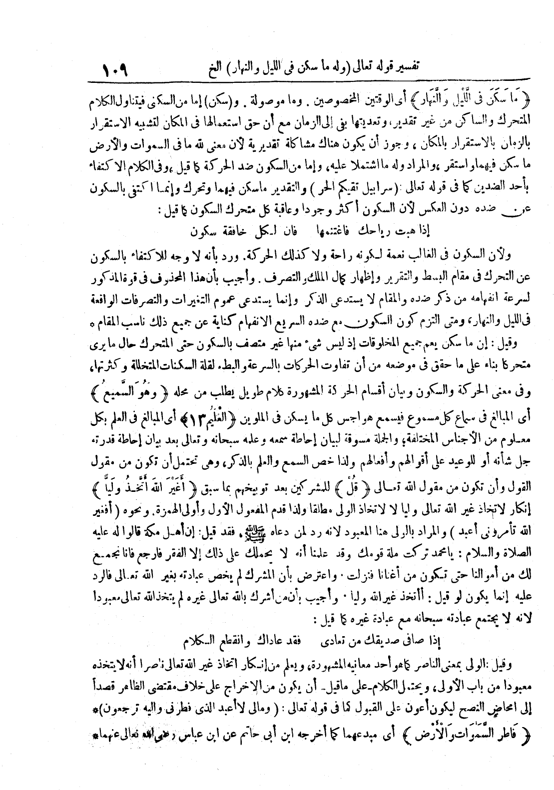 ما سكن في الليل والنهار أي الوقتين المخصوصين وما موصولة و سكن إا من السكنى فيتناول الكلام المتحرك والساكن من غير تقدير وتعديتها يفي الى الزمان مع أن حق استعمالها في المكان لتشبيه الاستقرار بالزمان بالاستقرار بالمكان وجوز أن يكون هناك مشاكلة تقديرية لأن معنى لله ما في السموات والأرض ما سكن فيهما واستقر والمراد وله ما اشتملا عليه وإا من السكون ضد الحركة كما قيل وفي الكلام الاكتفاء بأحد الضدين كما في قوله تعالى : سرابيل تقيكم الحر والتقدير ما سكن فيهما وتحرك وإنما اكتفى بالسكون عن ضده دون العكس لأن السكون أكثر وجودا وعاقبة كل متحرك السكون كما قيل : إذا هبت رياحك فاغتنمها فان لكل خافقة سكون ولأن السكون في الغالب نعمة لكونه راحة ولا كذلك الحركة ورد بأنه لا وجه للاكتفاء بالسكون عن التحرك في مقام البسط والتقرير وإظهار كمال الملك والتصرف وأجيب بأن هذا المحذوف في قوة المذكور لسرعة انفهامه من ذكر ضده والمقام لايستدعي الذكر وإنما يستدعي عموم التغيرات والتصرفات الواقعة في الليلو النهار ومتى التزم كون السكون مع ضده السريع الانفهام كناية عن جميع ذلك ناسب المقام