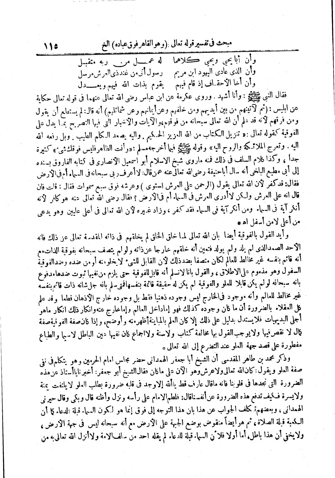 وأن أبا يحيى ويحيى كلاهما له عمل من ربه متقبل وأن الذي عادى اليهود ابن مريم رسول أتى من عند ذي العرش مرسل وأن أخا الاحقاف إذ قام فيهم يقوم بذات الله فيهم ويعدل فقال النبي صلى الله عليه و سلم : وأنا أشهد وروى عكرمة عن ابن عباس رضي الله تعالى عنهما في قوله تعالى حكاية عن ابليس : ثم لآتينهم من بين أيديهم ومن خلفهم وعن أيمانهم وعن شمائلهم أنه قال : لم يستطع أن يقول ومن فوقهم لأنه قد علم أن الله تعالى سبحانه من فوقهم والآيات والاخبار التي فيها التصريح بما يدل على الفوقية كقوله تعالى : تنزيل الكتاب من الله العزيز الحكيم وإليه يصعد الكلم الطيب وبل رفعه الله اليه وتعرج الملائكة والروح إليه وقوله صلى الله عليه و سلم فيما أخرجه مسلم : وأنت الظأهر فليس فوقك شيء كثيرة جدا وكذا كلام السلف في ذلك فمنه ما روى شيخ الاسلام ابو اسماعيل الانصاري في كتابه الفاروق بسنده إلى أبي مطيع البلخي أنه سأل أبا حنيفة رضي الله تعالى عنه عمن قال : لا أعرف ربي سبحانه وتعالى في السماء أم في الأرض فقال : قد كفر لأن الله تعالى يقول الرحمن على العرش استوى وعرشه فوق سبع سموات فقال : قلت فان قال انه على العرش ولكن لا أدري العرش في السماء أم في الأرض فقال رضي الله تعالى عنه هو كافر لأنه أنكر آية في السماء ومن أنكر آية في السماء فقد كفر وزاد غيره لأن الله تعالى في أعلى عليين وهو يدعى من أعلى لا من أسفل اه