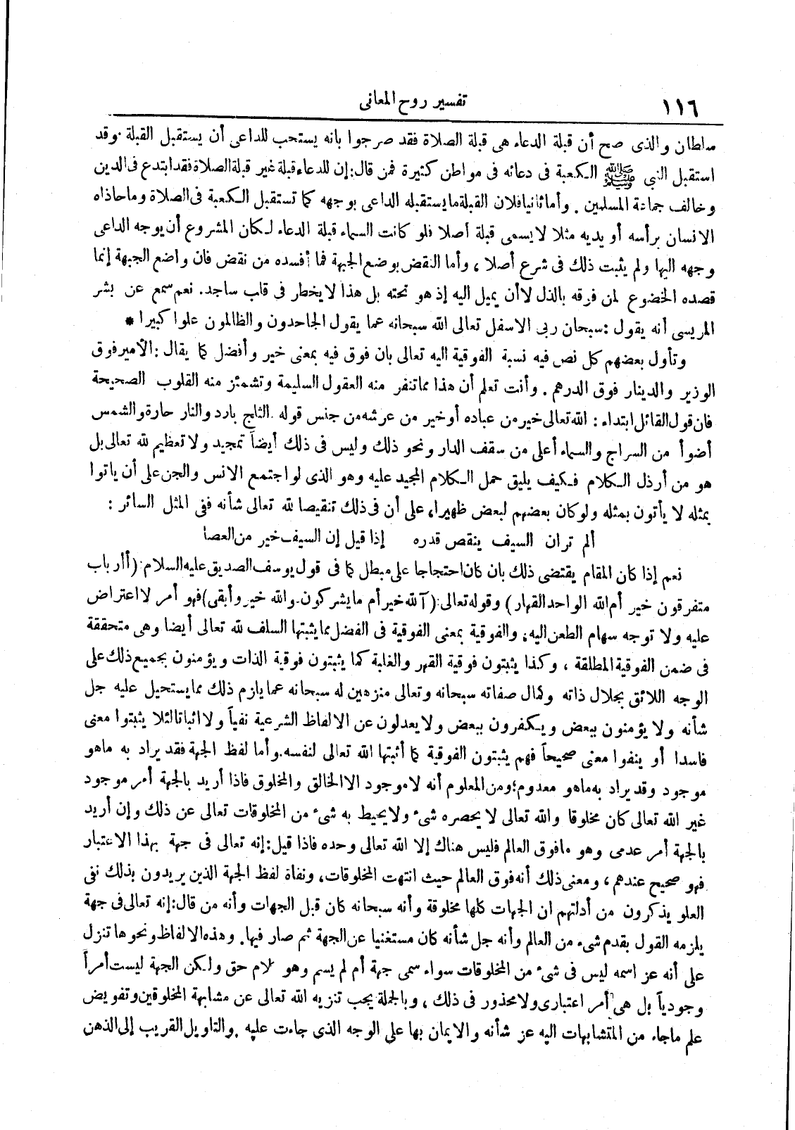 وتأول بعضهم كل نص فيه نسبة الفوقية اليه تعالى بأن فوق فيه بمعنى خير وأفضل كما يقال : الأمير فوق الوزير والدينار فوق الدرهم وأنت تعلم أن هذا مما تنفر منه العقول السليمة وتشمئز منه القلوب الصحيحة فان قول القائل ابتداء : الله تعالى خير من عباده أو خير من عرشه من جنس قوله الثلج بارد والنار حارة والشمس أضوأ من السراج والسماء اعلى من سقف الدار ونحو ذلك وليس في ذلك أيضا تمجد ولا تعظيم لله تعالى بل هو من أرذل الكلام فكيف يليق حمل الكلام المجيد عليه وهو الذي لو اجتمع الانس والجن على أن يأتوا بمثله لا يأتون بمثله ولو كان بعضهم لبعض ظهيرا على أن في ذلك تنقيصا لله تعالى شأنه ففي المثل السائر : ألم تر أن السيف ينقص قدره إذا قيل إن السيف خير من العصا نعم إذا كان المقام يقتضي ذلك بأن كان احتجاجا على مبطل كما في قول يوسف الصديق عليه السلام : أأرباب متفرقون خير أم الله الواحد القهار وقوله تعالى : آلله خير أم ما يشركون والله خير وأبقى فهو أمر لا اعتراض عليه ولا توجه سهام الطعن اليه والفوقية بمعنى الفوقية في الفضل مما يثبتها السلف لله تعالى أيضا وهي متحققة في ضمن الفوقية المطلقة وكذا يثبتون فوقية القهر والغلبة كما يثبتون فوقية الذات ويؤمنون بجميع ذلك على الوجه اللائق بجلال ذاته وكمال صفاته سبحانه وتعالى منزهين له سبحانه عما يلزم ذلك مما يستحيل عليه جل شأنه ولا يؤمنون ببعض ويكفرون ببعض ولا يعدلون عن الالفاظ الشرعية نفيا ولا اثباتا لئلا يثبتوا معنى فاسدا أو ينفوا معنى صحيحا فهم يثبتون الفوقية كما أثبتها الله تعالى لنفسه وأما لفظ الجهة فقد يراد به ماهو موجود وقد يراد به ماهو معدوم ومن المعلوم أنه لا موجود الا الخالق والمخلوق فاذا أريد بالجهة أمر موجود غير الله تعالى كان مخلوقا والله تعالى لا يحصره شيء ولا يحيط به شيء من المخلوقات تعالى عن ذلك وإن أريد بالجهة أمر عدمي وهو ما فوق العالم فليس هناك إلا الله تعالى وحده فاذا قيل : إنه تعالى في جهة بهذا الاعتبار فهو صحيح عندهم ومعنى ذلك أنه فوق العالم فليس هناك إلا الله تعالى وحده فاذا قيل : إنه تعالى في جهة بهذا الاعتبار فهو صحيح عندهم ومعنى ذلك أنه فوق العالم حيث انتهت المخلوقات ونفاة لفظ الجهة الذين يريدون بذلك نفي العلو يذكرون من أدلتهم أن الجهات كلها مخلوقة وأنه سبحانه كان قبل الجهات وأنه من قال : إنه تعالى في جهة يلزمه القول بقدم شيء من العالم وأنه جل شأنه كان مستغنيا عن الجهة ثم صار فيها وهذه الألفاظ ونحوها تنزل على أنه عز اسمه ليس في شيء من المخلوقات سواء سمى جهة أم لم يسم وهو كلام حق ولكن الجهة ليست أمرا وجوديا بل هي أمر اعتباري ولا محذور في ذلك وبالجملة يجب تنزيه الله تعالى عن مشابهة المخلوقين وتفويض علم ما جاء من المتشابهات اليه عز شأنه والايمان بها على الوجه الذي جاءت عليه والتأويل القريب إلى الذهن