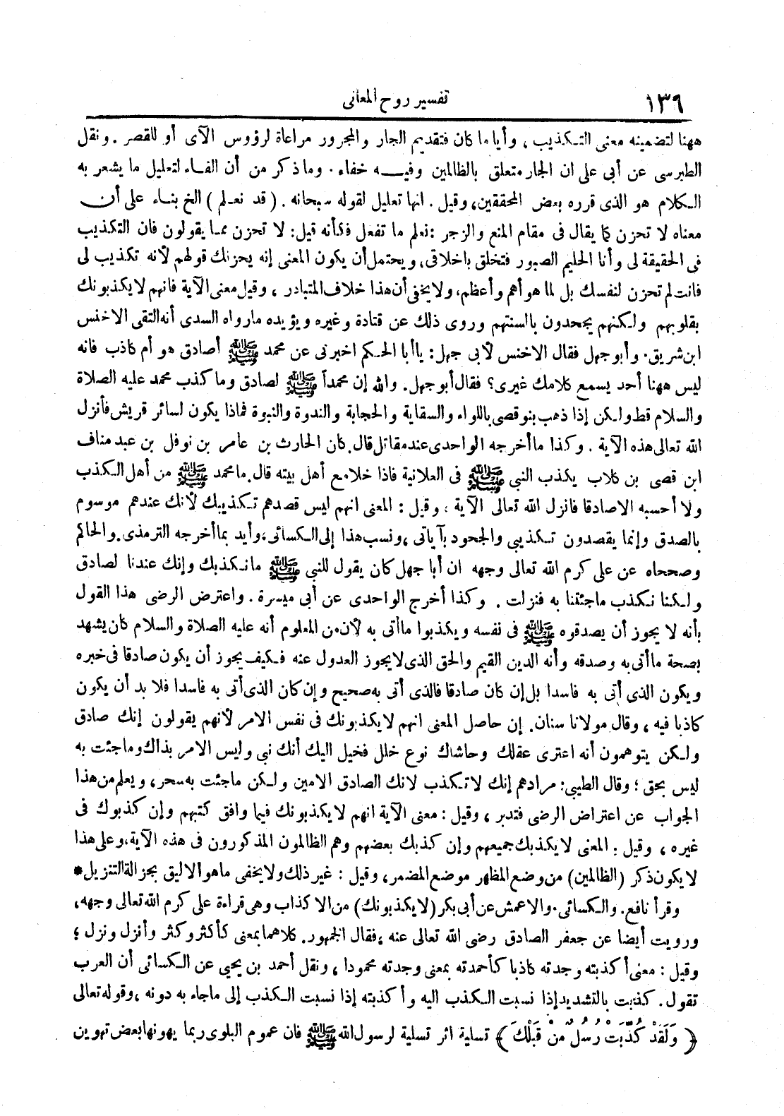 ههنا لتضمينه معنى التكذيب وأيا ما كان فتقديم الجار و المجرور مراعاة لرؤوس الآي أو للقصر ونقل الطبرسي عن أبي على أن الجار متعلق بالظالمين وفيه خفاء وما ذكر من أن الفاء لتعليل ما يشعر به الكلام هو الذي قرره بعض المحققين وقيل انها تعليل لقوله سبحانه قد نعلم الخ بناء على أن معناه لا تحزن كما يقال في مقام المنع والزجر : نعلم ما تفعل فكأنه قيل : لا تحزن مما يقولون فان التكذيب في الحقيقة لي وأنا الحليم الصبور فتخلق بأخلاقي ويحتمل أن يكون المعنى إنه يحزنك قولهم لأنه تكذيب لي فانت لم تحزن لنفسك بل لما هو أهم واعظم ولا يخفى أن هذا خلاف المتبادر وقيل معنى اةية فانهم لا يكذبونك بقلوبهم ولكنهم يجحدون بالسنتهم وروي ذلك عن قتادة وغيره ويؤيده ما رواه السدي أنه التقى الأخنس ابن شريق وابو جهل فقال الأخنس لأبي جهل : يا أبا الحكم أخبرني عن محمد صلى الله عليه و سلم أصادق هو أم كاذب فانه ليس ههنا أحد يسمع كلامك غيري فقال أبو جهل والله إن محمدا صلى الله عليه و سلم لصادق وما كذب محمد عليه الصلاة و السلام قط ولكن إذا ذهب بنو قصي باللواء والسقاية والحجابة والندوة والنبوة فماذا يكون لسائر قريش فأنزل الله تعالى هذه الآية وكذا ما أخرجه الواحدي عند مقاتل قال كان الحارث بن عامر بن نوفل بن عبد مناف ابن قصي بن كلاب يكذب النبي صلى الله عليه و سلم في العلانية فاذا خلا مع أهل بيته قال ما محمد صلى الله عليه و سلم من أهل الكذب ولا أحسبه الا صادقا فانزل الله تعالى الآية وقيل : المعنى أنهم ليس قصدهم تكذيبك لأنك عندهم موسوم بالصدق وإنما يقصدون تكذيبي والجحود بآياتي ونسب هذا إلى الكسائي وأيد بما أخرجه الترمذي والحاكم وصححاه عن علي كرم الله تعالى وجهه أن ابا جهل كان يقول للنبي صلى الله عليه و سلم ما نكذبك وإنك عندنا لصادق ولكنا نكذب ما جئتنا به فنزلت وكذا أخرج الواحدي عن أبي ميسرة واعترض الرضى هذا القول بأنه لا يجوز أن يصدقوه صلى الله عليه و سلم في نفسه ويكذبوا ما أتى به لأن من المعلوم أنه عليه الصلاة و السلام كان يشهد بصحة ما أتى به وصدقه وأنه الدين القيم والحق الذي لا يجوز العدول عنه فكيف يجوز أن يكون صادقا في خبره ويكون الذي أتى به فاسدا بل إن كان صادقا فالذي أتي به صحيح وإن كان الذي أتى به فاسدا فلابد أن يكون كاذبا فيه وقال مولانا سنان إن حاصل المعنى انهم لا يكذبونك في نفس الأمر لأنهم يقولون إنك صادق ولكن يتوهمون أنه اعترى عقلك وحاشاك نوع خلل فخيل اليك أنك نبي وليس الأمر بذاك وما جئت به ليس بحق وقال الطيبي : مرادهم إنك لا تكذب لانك الصادق الأمين ولكن ما جئت به سحر ويعلم من هذا الجواب عن اعتراض الرضى فتدبر وقيل : معنى الآية أنهم لا يكذبونك فيما وافق كتبهم وإن كذبوك في غيره وقيل : المعنى لا يكذبك جميعهم وإن كذبك بعضهم وهم الظالمون المذكورون في هذه الآية وعلى هذا لا يكون ذكر الظالمين من وضع المظهر موضع المضمر وقيل : غير ذلك ولا يخفى ما الأليق بجزالة التنزيل