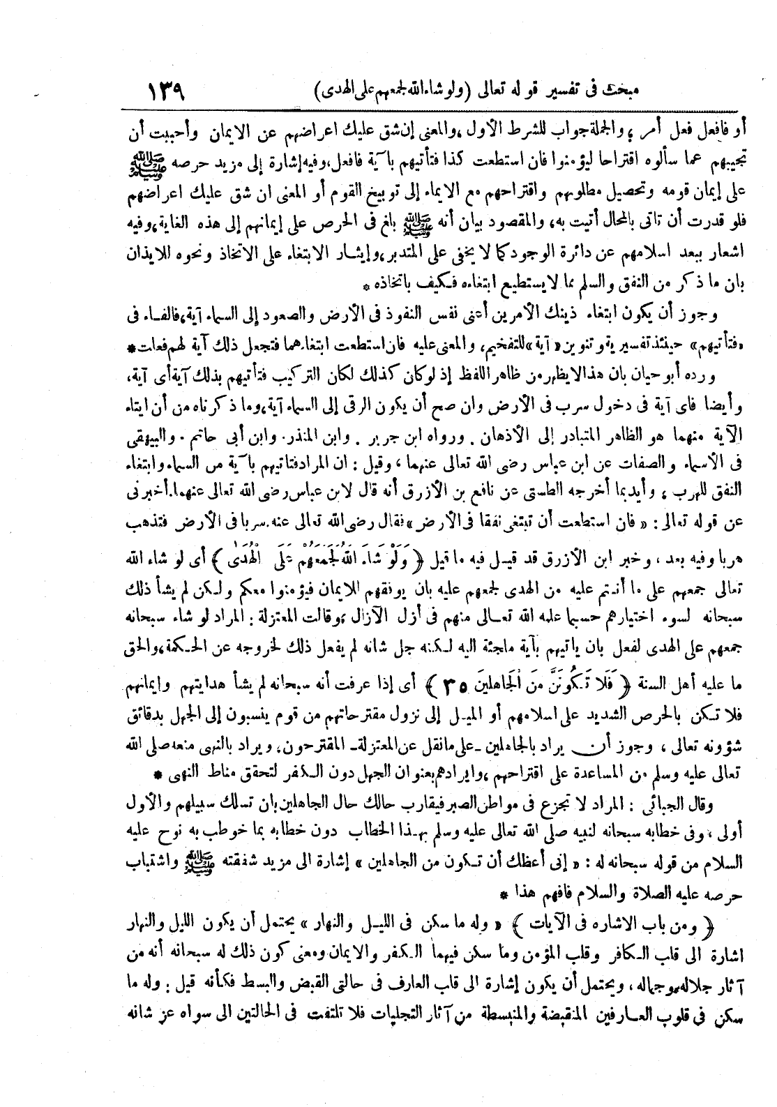 ورده أبو حيان بان هذا لايظهر من ظاهر اللفظ إذ لو كان كذلك لكان التركيب فتأتيهم بذلك آية أي آية وأيضا فأي أية في دخول سرب في الأرض وان صح أن يكون الرقي إلى السماء آية وما ذكرناه من أن إيتاء الآية منهما هو الظأهر المتبادر إلى الأذهان ورواه ابن جرير وابن المنذر وابن ابي حاتم والبيهقي في الأسماء والصفات عن ابن عباس رضي الله تعالى عنهما وقيل : ان المراد فتأتيهم بآية من السماء وابتغاء النفق للهرب وأيد بما أخرجه الطستي عن نافع بن الأزرق أنه قال لابن عباس رضي الله تعالى عنهما أخبرني عن قوله تعالى : فان استطعت أن تبتغي نفقا في الأرض فقال رضي الله تعالى عنه سربا في الأرض فتذهب هربا وفيه بعد وخبر الأزرق قي قيل فيه ما قيل ولو شاء الله لجمعهم على الهدى أي لوشاء الله تعالى جمعهم على ما أنتم عليه من الهدى لجمعهم عليه بأن يوفقهم للايمان فيؤمنوا معكم ولكن لم يشأ ذلك سبحانه لسوء اختيارهم حسبما علمه الله تعالى منهم في أزل الآزل وقال المعتزلة : المراد لو شاء سبحانه جمعهم على الهدى لفعل بأن يأتيهم بآية ملجئة اليه لكنه جل شأنه لم يفعل ذلك لخروجه عن الحكمة والحق ما عليه أهل السنة فلا تكونن من الجاهلين