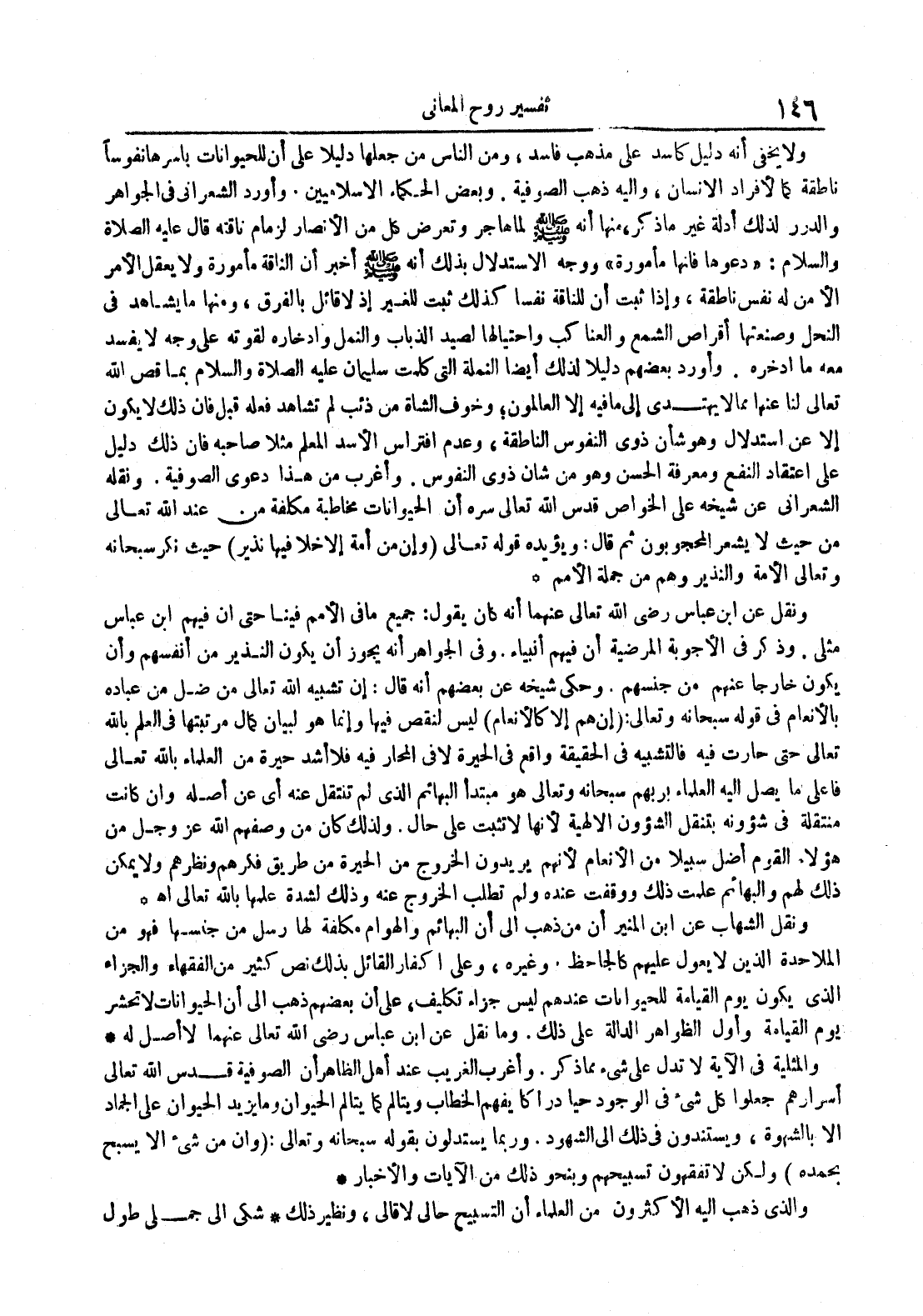 ولا يخفى أنه دليل كاسد على مذهب فاسد ومن الناس من جعلها دليلا على أن للحيوانات بأسرها نفوسا ناطقة كما لأفراد الانسان وإليه ذهب الصوفية وبعض الحكماء الاسلاميين وأورد الشعراني في الجواهر والدرر لذلك أدلة غير ما ذكر منها أنه صلى الله عليه و سلم لما هاجر وتعرض كل من الانصار لزمام ناقته قال عليه الصلاة و السلام : دعوها فانها مأمورة ووجه الاستدلال بذلك أنه صلى الله عليه و سلم أخبر أن الناقة مأمورة ولا يعقل الأمر إلا من له نفس ناطقة وإذا ثبت أن للناقة نفسا كذلك ثبت للغير إذ لا قائل بالفرق ومنها ما يشاهد في النحل وصنعتها أقراص الشمع والعناكب واحتيالها لصيد الذباب والنمل وادخاره لقوته على وجه لا يفسد معه ما ادخره وأورد بعضهم دليلا لذلك أيضا النملة التي كلمت سليمان عليه الصلاة و السلام بما قص الله تعالى لنا عنها مما لايهتدي إلى مافيه إلا العالمون وخوف الشاة من ذئب لم تشاهد فعله قبل فان ذلك لا يكون إلا عن استدلال وهو شأن ذوي النفوس الناطقة وعدم افتراس الأسد المعلم مثلا صاحبه فان ذلك دليل على اعتقاد النفع ومعرفة الحسن وهو من شأن ذوي النفوس وأغرب من هذا دعوى الصوفية ونقله الشعراني عن شيخه علي الخواص قدس الله تعالى سره أن الحيوانات مخاطبة مكلفة من عند الله تعالى من حيث لا يشعر المحجوبون ثم قال : ويؤيده قوله تعالى وإن من أمة إلا خلا فيها نذير حيث ذكر سبحانه وتعالى الأمة والنذير وهم من جملة الأمم