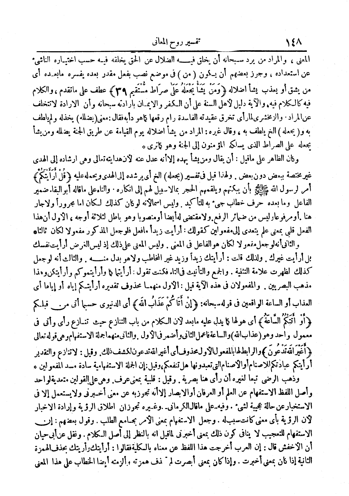 والثاني أنه لو جعل مفعولا لكان هو الفاعل في المعنى وليس المعنى على ذلك إذ ليس الغرض أرأيت نفسك بل أرأيت غيرك ولذلك قلت : أرأيتك زيدا وزيد غير المخاطب ولا هو بدل منه والثالث أنه لو جعل كذلك لظهرت علامة التثنية والجمع والتأنيث في التاء فكنت تقول : أرأيتما كما وأرأيتموكم وأرأيتكن وهذا مذهب البصريين والمفعولان في هذه الآية قيل : الأول منهما محذوف تقديره أرأيتكم إياه أو إياها أي العذاب أو لاساعة الواقعين في قوله سبحانه : إن أتاكم عذاب الله أي الدنيوي حسبما أتى من قبلكم أو أتتكم الساعة أي هولها كما يدل عليه ما بعد لأن الكلام من باب التنازع حيث تنازع رأي وأتي في معمول واحد هو عذاب الله والساعة فاعمل الثاني وأضمر في الأول والثاني منهما جملة الاستفهام وهي قوله تعالى أغير الله تدعون والرابط لها بالمفعول الأول محذوف أي أغير الله تدعون لكشف ذلك وقيل : لا تنازع والتقدير أرأيتكم عبادتكم للاصنام أو ألاصنام التي تعبدونها هل تنفعكم وقيل : إن الجملة الاستفهامية سادة مسد المفعولين