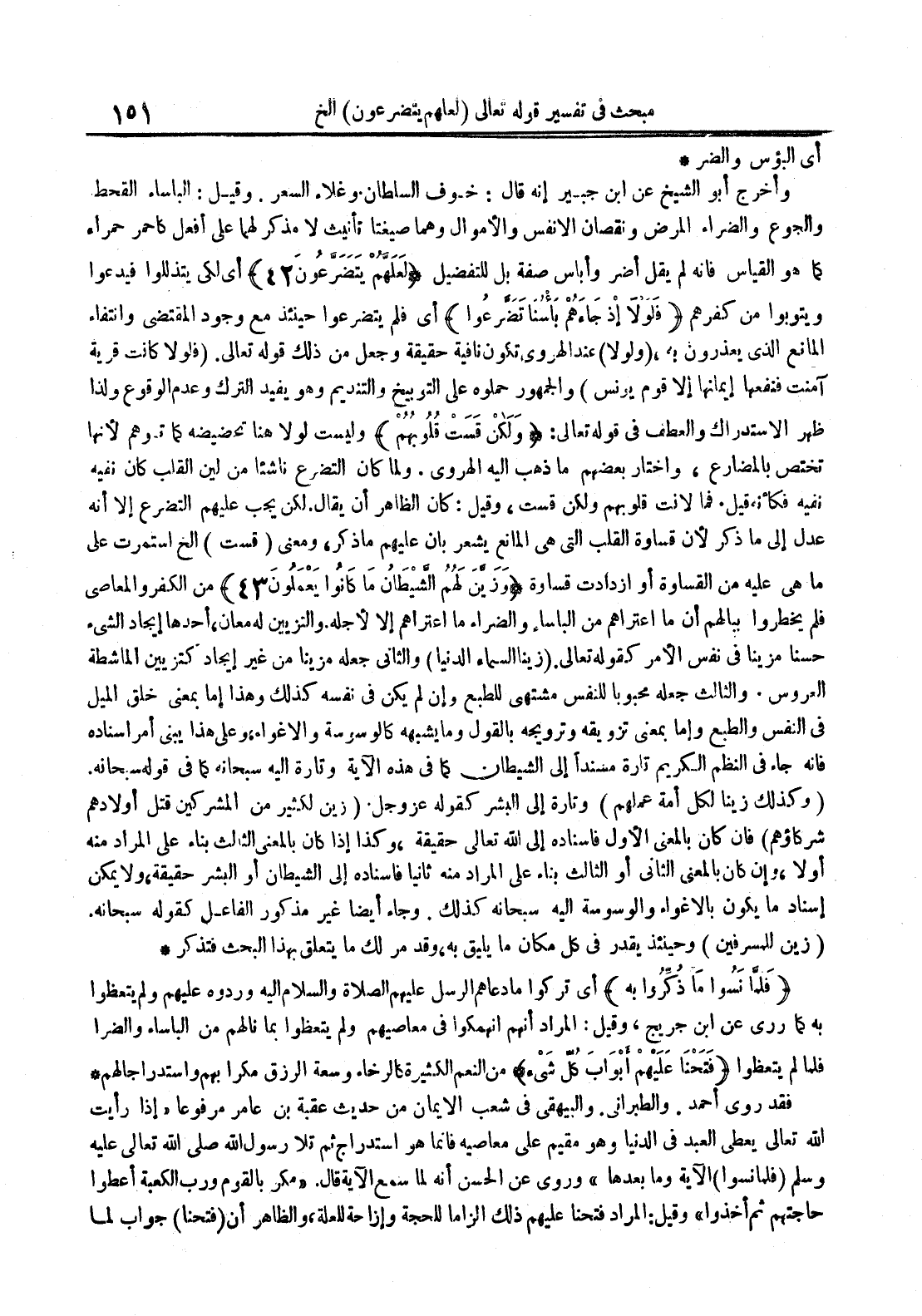 - من الكفر والمعاصي فلم يخطروا ببالهم أن ما اعتراهم من البأساء والضراء ما اعتراهم إلا لأجله والتزيين له معان أحدهما إيجاد الشيء حسنا مزينا في نفس الأمر كقوله تعالى زينا السماء الدنيا والثاني جعله مزينا من غير إيجاد كتزيين الماشطة العروس والثالث جعله محبوبا للنفس مشتهى للطبع وإن لم يكن في نفسه كذلك وهذا إما بمعنى خلق الميل في النفس والطبع وإا بمعنى تزويقه وترويجه بالقول وما يشبهه كالوسوسة والاغراء وعلى هذا يبنى أمر اسناده فانه جاء في النظم الكريم تارة مسندا إلى الشيطان كما في هذه الآية وتارة اليه سبحانه كما في قوله سبحانه وكذلك زينا لكل أمة عملهم وتارة إلى البشر كقوله عز و جل زين لكثير من المشركين قتل أولادهم شركاؤهم فان كان بالمعنى الأول فاسناده إلى الله تعالى حقيقة وكذلك إذا كان بالمعنى الثالث بناء على المراد منه أولا وإن كان بالمعنى الثاني أو الثالث بناء على المراد منه ثانيا فاسناده إلى الشيطان أو البشر حقيقة ولا يمكن إسناد ما يكون بالاغواء والوسوسة اليه سبحانه كذلك وجاء أيضا غير مذكور الفاعل كقوله سبحانه زين للمسرفين وحينئذ يقدر في كل مكان ما يليق به وقد مر لك ما يتعلق بهذا البحث فتذكر