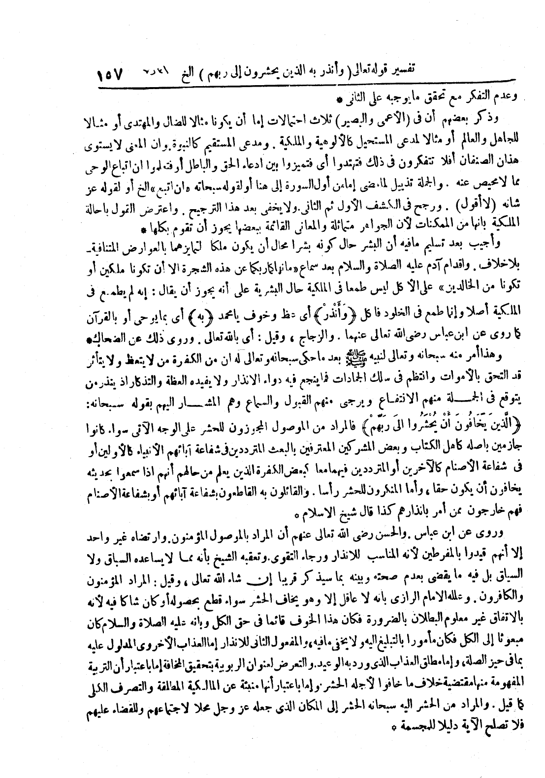 وروي عن ابن عباس والحسن رضي الله تعالى عنهم أن المراد بالموصول المؤمنون وارتضاه غير واحد إلا أنهم قيدوا بالمفرطين لأنه المناسب للانذار ورجاء التقوى وتعقبه الشيخ بأنه مما لا يساعده السباق ولا السياق بل فيه ما يقضي بعدم صحته وبينه بما سيذكر قريبا إن شاء الله تعالى وقيل : المراد المؤمنون والكافرون وعلله الامام الرازي بأنه لا عاقل إلا وهو يخاف الحشر سواء قطع بحصوله أو كان شاكا فيه لأنه بالاتفاق غير معلوم البطلان بالضرورة فكان هذا الخوف قائما في حق الكل وبأنه عليه الصلاة و السلام كان مبعوثا إلى الكل فكان مأمورا بالتبليغ اليه ولا يخفى ما فيه والمفعول الثاني للانذار إما بالعذاب الاخوري المدلول عليه بما في حيز الصلة وإما مطلق العذاب الذي ورد به الوعيد والتعرض لعنوان الربوبية بتحقيق المخافة إا باعتبار أن التربية المفهومة منها مقتضية خلاف ما خافوا لأجله الحشر وإما باعتبار أنها منبئة عن المالكية المطلقة والتصرف الكلي كما قيل والمراد من الحشر اليه سبحانه الحشر إلى المكان الذي جعله عز و جل محلا لاجتماعهم وللقضاء عليهم فلا تصلح اةية دليلا للمجسمة