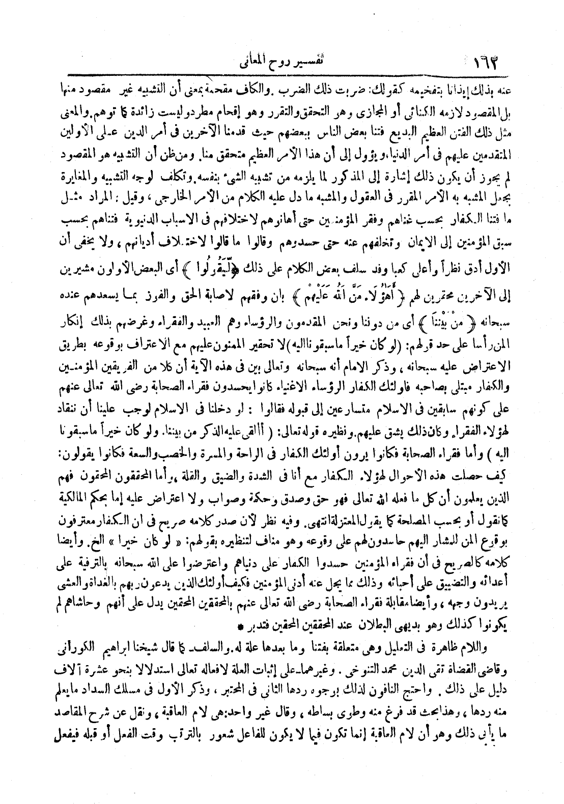 عنهعنه بذلك إيذانا بتفخيمه كقولك : ضربت ذلك الضرب والكاف مقحمة بمعنى أن التشبيه غير مقصود منها بل المقصود لازمه الكنائي أو المجازي وهو التحقق والتقرر وهو إقحام مطرد وليست زائدة كما توهم والمعنى مثل ذلك الفتن العظيم البديع فتنا بعض الناس ببعضهم حيث قدما الآخرين في أمر الدين على ألاولين المتقدمين عليهم في أمر الدنيا ويؤول إلى دا الأمر العظيم متحقق منا ومن ظن أن التشبيه هو المقصود لم يجوز أن يكون ذلك إشارة إلى المذكور لما يلزمه من تشبيه الشيء بنفسه وتكلف لوجه التشبيه والمغايرة بجعل المشبه به الأمر المقرر في العقول والمشبه ما دل عليه الكلام من الأمر الخارجي وقيل : المراد مثل ما فتنا الكفار بحسب غناهم وفقر المؤمنين حتى أهانوهم لاخلافهم في الاسباب الدنيوية فتناهم بحسب سبق المؤمنين إلى الايمان وتخلفهم عنه حتى حسدوهم وقالوا ما قالوا لاختلاف أديانهم ولا يخفى أن الأول أدق نظرا أو أعلى كعبا وقد سلف بعض الكلام على ذلك ليقولوا أي البعض الأولون مشيرين الى ألآخرين محقرين لهم أهؤلاء من الله عليهم بان وفقهم لاصابة الحق والفوز بما يسعدهم عنده سبحانه من بيننا أي من دوننا ونحن المقدمون والرؤساء وهم العبيد والفقراء وغرضهم بذلك إنكار المن رأسا على حد قولهم : لو كان خيرا لما سبقونا إليه لا تحقير الممنون عليهم مع الاعتراف بوقوعه بطريق الاعتراض عليه سبحانه وذكر الامام أنه سبحانه وتعالى بين في هذه الآية أن كلا من الفريقين المؤمنين والكفار مبتلى بصاحبه فأولئك الكفار الرؤساء الأغنياء كانوا يحسدون فقراء الصحابة رضي الله تعالى عنهم على كونهم سابقين في الاسلام متسارعين إلى قبوله فقالوا : لو دخلنا في الاسلام لوجب علينا أن ننقاد لهؤلاء الفقراء وكان ذلك يشق عليهم ونظيره قوله تعالى : أألقي عليه الذكر من بيننا ولو كان خيرا ما سبقونا اليه وأما فقراء الصحابة فكانوا يرون أولئك الكفار في الراحة والمسرة والخصب والسعة فكانوا يقولون كيف حصلت هذه الأحوال لهؤلاء الكفار مع أنا في الشدة والضيق والقلة والمحققون المحقون فهم الذين يعلمون أن كل ما فعله الله تعالى فهو حق وصدق وحكمة وصواب ولا اعتراض عليه إما بحكم المالكية كما نقول أو بحسب المصلحة كما يقول المعتزلة انتهى وفيه نظر لأن صدر كلامه صريح في أن الكفار معترفون بوقوع المن المشار اليهم حاسدون لهم على وقوعه وهو مناف لتنظيره بقولهم : لو كان خيرا الخ وأيضا كلامة كالصريح في أن فقراء المؤمنين حسدوا الكفار على دنياهم واعترضوا على الله سبحانه بالترفيه على أعدائه والتضييق على أحبائه وذلك مما يجل عنه أدنى المؤمنين فكيف أولئك الذين يدعون ربهم بالغداة والعشي يريدون وجهه وأيضا مقابلة فقراء الصحابة رضي الله تعالى عنهم بالمحققين المحقين يدل على أنهم وحاشاهم لم يكونوا كذلك وهو بديهي البطلان عند المحققين المحقين فتدبر