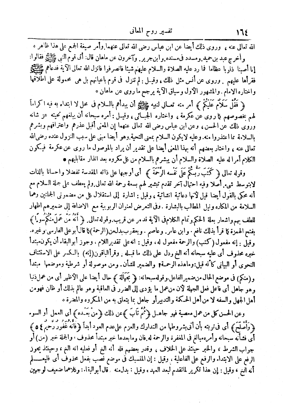 وقوله تعالى كتب ربكم على نفسه الرحمة أي أوجبها على ذاته المقدسة تفضلا واحسانا بالذات لا بتوسط شيء أصلا وفيه احتمال آخر تقدم تبشير لهم بسعة رحمة الله تعالى ولم يعطف على جملة السلام مع أنه محكي بالقول أيضا قيل لأنها دعائية انشائية وقيل : اشارة إلى استقلال كل من مضموني الجملتين وهما السلامة من المكاره ونيل المطالب بالبشارة وفي التعرض لعنوان الربوبية مع الاضافة إلى ضميرهم اظهار للطف بهم واشعار بعلة الحكم وتمام الكلام في الآية قد مر عن قريب وقوله تعالى : أنه من عمل منكم سوءا بفتح الهمزة كما قرأ بذلك نافع وابن عامر وعاصم ويعقوب بدل من الرحمة كما قال أبو علي الفارسي وغيره وقيل : إنه مفعول كتب والرحمة مفعول له وقيل : انه على تقدير اللام وجوز أبو البقاء أن يكون مبتدأ خبره محذوف أي عليه سبحانه أنه ألخ ودل على ذلك ما قبله وقرأ الباقون إنه بالكسر على الاستئناف النحوي البياني كأنه قيل : وما هذه الرحمة والضمير للشأن ومن موصولة أو شرطية وموضعها مبتدأ و منكم في موضع الحال من ضمير الفاعل وقوله سبحانه : بجهالة حال أيضا على الأظهر أي من عمل ذنبا وهو جاهل أي فاعل فعل الجهلة لأن من عمل ما يؤدي إلى الضرر في العاقبة وهو عالم بذلك أو ظان فهو من أهل الجهل والسفه لا من أهل الحكمة والتدبير أو جاهل بما يتعلق به من المكروه والمضرة