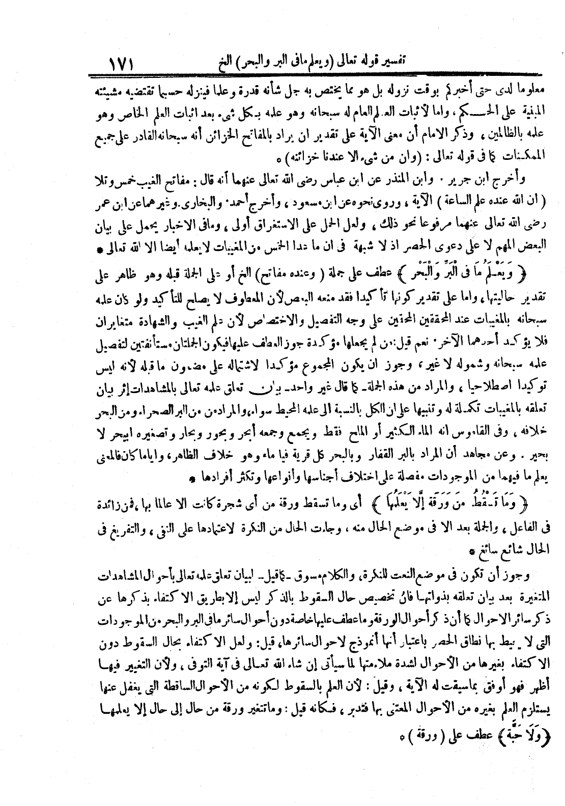 وجوز أن تكون في موضع النعت للنكرة والكلام مسوق كما قيل لبيان تعلق علمه بأحوال المشاهدات المتغيرة بعد بيان تعلقه بذواتها فان تخصيص حال السقوط بالذكر ليس إلا بطريق الاكفاء بذكرها عن ذكر سائر الأحوال كما أن ذكر أحوال الورقة وما عطف عليها خاصة دون أحوال سائر ما في البر والبحر من الموجودات التي لا يحيط بها نطاق الحصر باعتبار أنها أنموذج لاحوال سائرها قيل : ولعل الاكتفاء بحال السقوط دون الاكتفاء بغيرها من الأحوال لشدة ملاءمتها لما سيأتي نإ شاء الله تعالى في آية الوفي ولأن التغيير فيها أظهر فهو أوفق بما سيقت له الآية وقيل : لأن العلم بالسقوط لكونه من الأحوال الساقطة التي يغفل عنها يستلزم العلم بغيره من الأحوال المعتنى بها فتدبر فكأنه قيل : وما تتغير ورقة من حال إلى حال إلا يعلمها ولا حبة عطف على ورقة