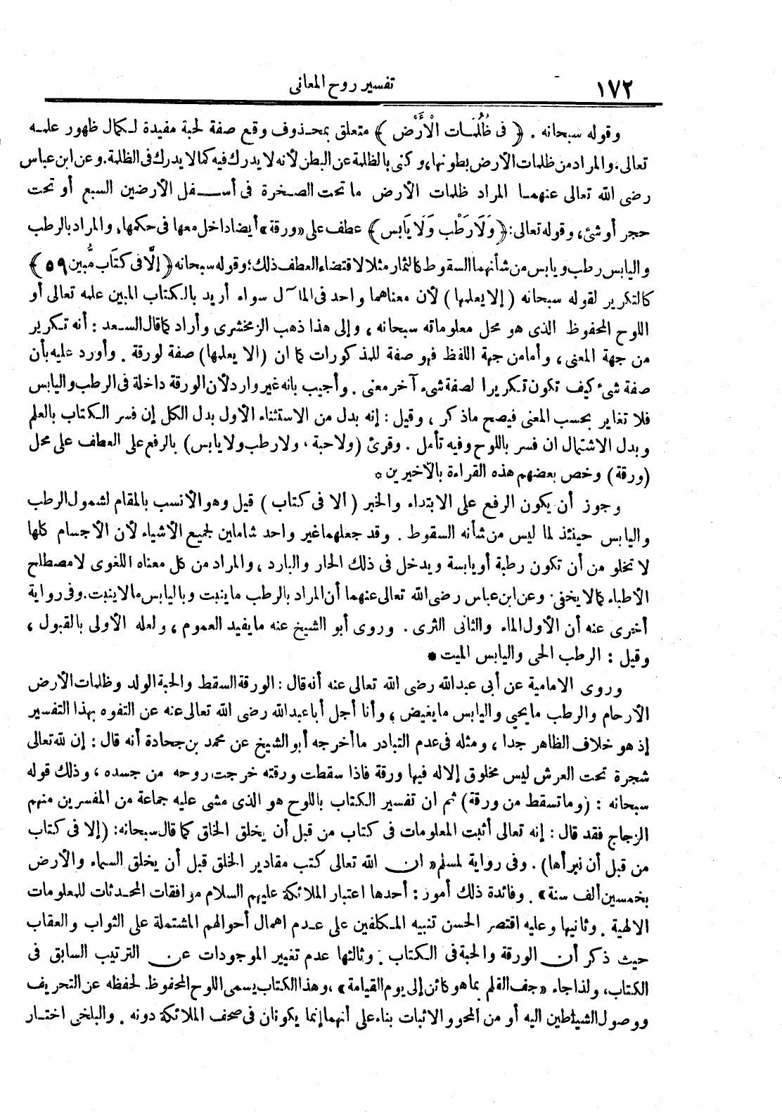 وجوز أن يكون الرفع على الابتداء والخبر الا في كتاب قيل وهو الأنسب بالمقام لشمول الرطب واليابس حينئذ لما ليس من شأنه السقوط وقد جعلهما غير واحد شاملين لجميع الأشياء لأن الأجسام كلها لا تخلوا من أن تكون رطبة أو يابسة ويدخل في ذلك الحار والبارد والمراد من كل معناه اللغوي لا مصطلح الاطباء كما لا يخفى وعن ابن عباس رضي الله تعالى عنهما أن المراد بالرطب ما ينبت واليابس ما لا ينبس وفي رواية أخرى عنه أن الأول الماء والثاني الثرى وروى أبو الشيخ عنه ما يفيد العموم ولعله الأولى بالقبول وقيل : الرطب الحي واليابس الميت