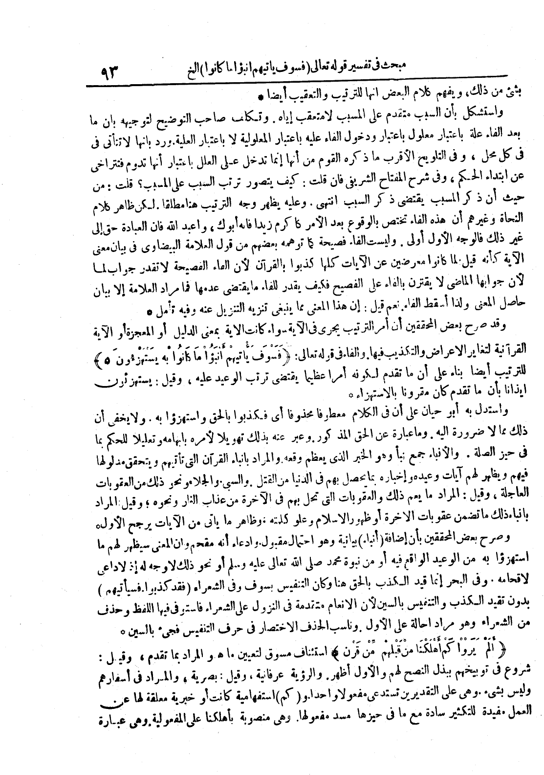 واستشكل بأن السبب متقدم على المسبب ولا متعقب إياه وتكلف صاحب التوضيح لتوجيهه بان ما بعد الفاء علة باعتبار معلول باعتبار ودخول الفاء عليه باعتبار المعلولية لا باعتبار العلية ورد بأنها لا تتأتى في كل محل وفي التلويح الأقرب ما ذكره القوم من أنها إنما تدخل على العلل باعتبار أنها تدوم فتتراخى عن ابتداء الحكم وفي شرح المفتاح الشريفي فان قلت : كيف يتصور ترتب السبب على المسبب قلت : من حيث أن ذكر المسبب يقتضي ذكر السبب أنتهى وعليه يظهر وجه الترتيب هنا مطلقا لكن ظاهر كلام النحاة وغيرهم أن هذه الفاء تختص بالوقوع بعد الأمر كأكرم زيدا فانه أبوك واعبد الله فان العبادة حق إلى غير ذلك فالوجه الأول أولى وليست الفاء فصيحة كما توهمه بعضهم من قول العلامة البيضاوي في بيان معنى الآية كأنه قيل : لما كانوا معرضين عن الآيات كلها كذبوا بالقرآن لأن الفاء الفصيحة لا تقدر جواب لما لأن جوابها الماضي لا يقترن بالفاء الفصيح فكيف يقدر للفاء ما يقتضي عدمها فما مراد العلامة إلا بيان حاصل المعنى ولذا أسقط الفاء نعم قيل : إن هذا المعنى مما ينبغي تنزيه التنزيل عنه وفيه تأمل