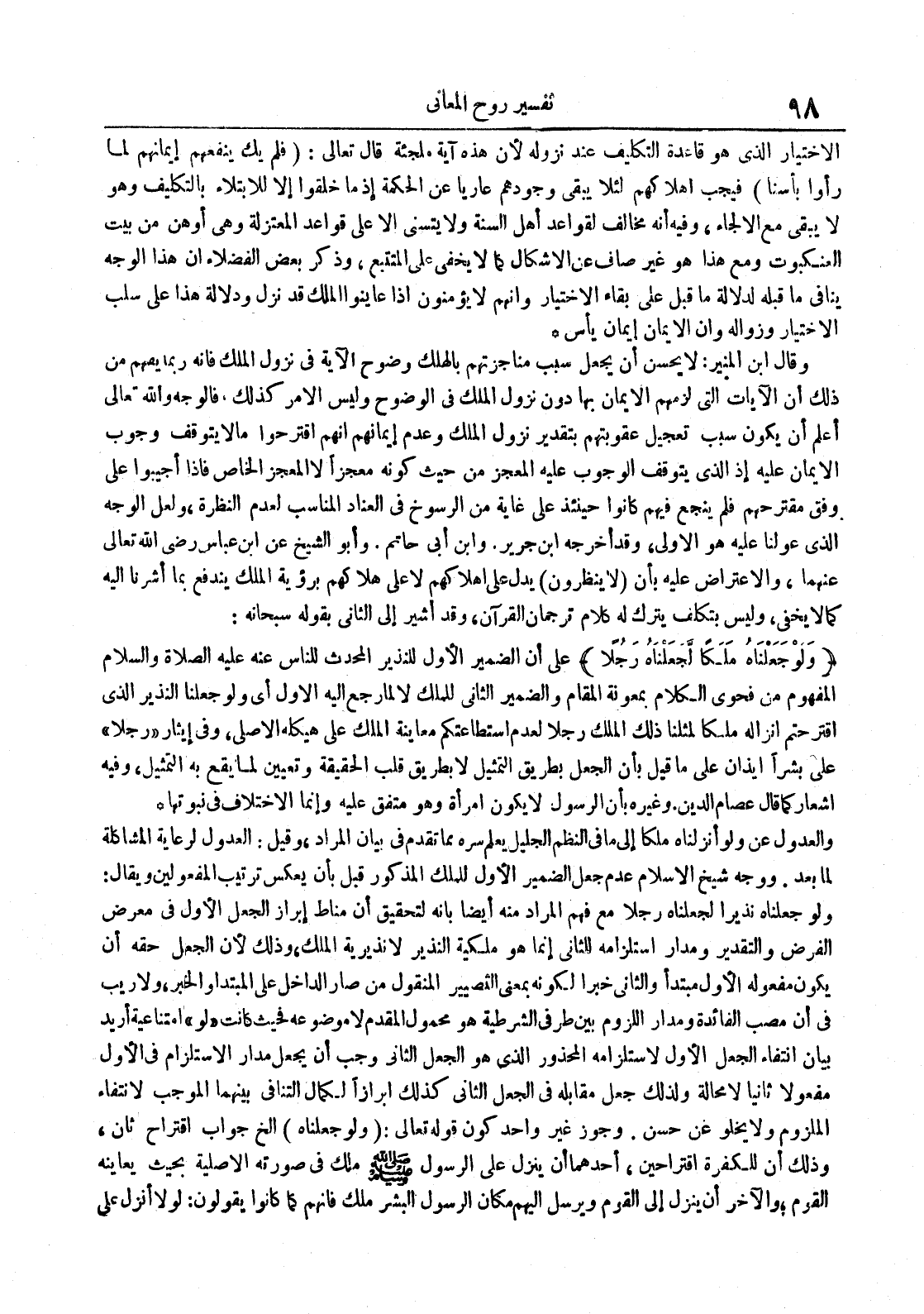 وقال ابن المنير : لا يحسن أن يجعل سبب مناجرتهم بالهلك وضوح الآية في نزول الملك فانه ربما يفهم من ذلك أن الآيات التي لزمهم الايمان بها دون نزول الملك في الوضوح وليس الامر كذلك فالوجه والله تعالى أعلم أن يكون سبب تعجيل عقوبتهم بتقدير نزول الملك وعدم إيمانهم أنهم اقترحوا ما يتوقف وجوب الايمان عليه إذ الذي يتوقف الوجوب عليه المعجز من حيث كونه معجزا لا المعجز الخاص فاذا أجيبوا على وفق مقترحهم فلم ينجع فيهم كانوا حينئذ على غاية من الرسوخ في العناد المناسب لعدم النظرة ولعل الوجه الذي عولنا عليه هو الاولى وقد أخرجه ابن جرير وابن ابي حاتم وأبو الشيخ عن ابن عباس رضي الله تعالى عنهما والاعتراض عليه بأن لا ينظرون يدل على اهلاكهم لا على هلاكهم بروية الملك يندفع بما أشرنا اليه كما لا يخفى وليس بتكليف يترك له كلام ترجمان القرآن وقد أشي إلى الثاني بقوله سبحانه : ولو جعلناه ملكا لجعلناه رجلا على أن الضمير الأول للنذير المحدث للناس عنه عليه الصلاة و السلام المفهوم من فحوى الكلام بمعونة المقام والضمير الثاني للملك لا لما رجع اليه الاول أي ولو جعلنا النذير الذي اقترحتم انزاله ملكا لمثلنا ذلك الملك رجلا لعدم استطاعتهم معاينة الملك على هيكله الأصلي وفي إيثار رجلا على بشرا ايذان على ما قيل بأن الجعل بطريق التمثيل لا بطريق قلب الحقيقة وتعيين لما يقع به التمثيل وفيه اشعار كما قال عصام الدين وغيره بأن الرسول لا يكون امرأة وهو متفق عليه وإنما الاختلاف في نبوتها