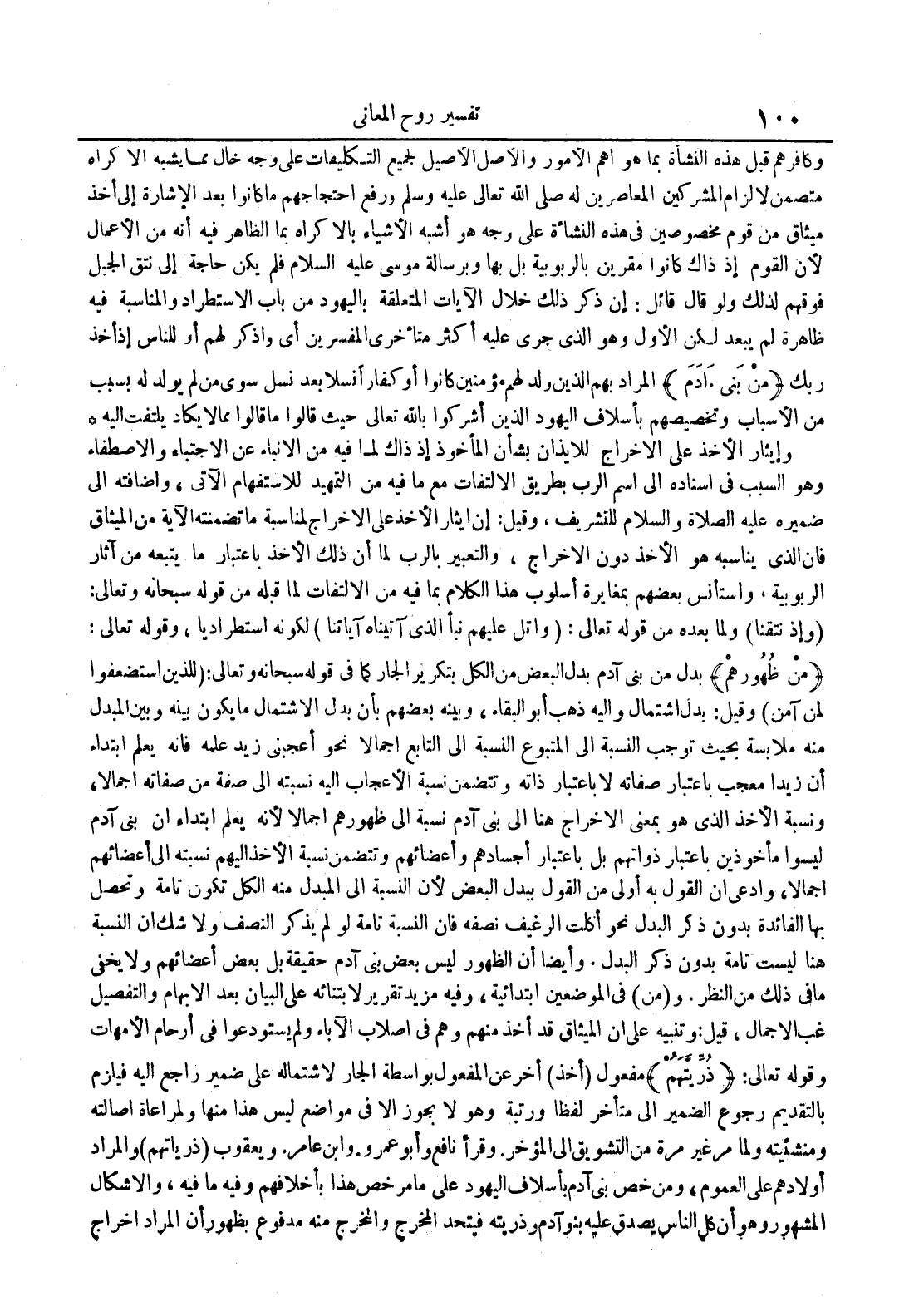 وكافرهم قبل هذه النشأة بما هو أهم الأمور والأصل الأصيل لجميع التكليفات على وجه خال مما يشبه الإكراه متضمن لإلزام المشركين المعصرين له صلى الله تعالى عليه وسلم ورفع إحتجاجهم ما كانوا بعد الإشارة إلى أخذ ميثاق من قوم مخصوصين في هذه النشأة على وجه هو أشبه الأشياء بالإكراه بما الظاهر فيه أنه من الأعمال لأن القوم إذ ذاك كانوا مقرين بالربوبية بل بها وبرسالة موسى عليه السلام فلم يكن حاجة إلى نتق الجبل فوقهم لذلك ولو قال قائل : إن ذكر ذلك خلال الآيات المتعلقة باليهود من باب الإستطراد والمناسبة فيه ظاهرة لم يبعد لكن الأول وهو الذي جرى عليه أكثر متأخري المفسرين أي واذكر لهم أو للناس إذ أخذ ربك من بني آدم المراد بهم الذين ولد لهم مؤمنين كانوا أو كفارا نسلا بعد نسل سوى من لم يولد له بسبب من الأسباب وتخصيصهم بأسلاف اليهود الذين أشركوا بالله تعالى حيث قالوا مما لايكاد يلتفت إليه
