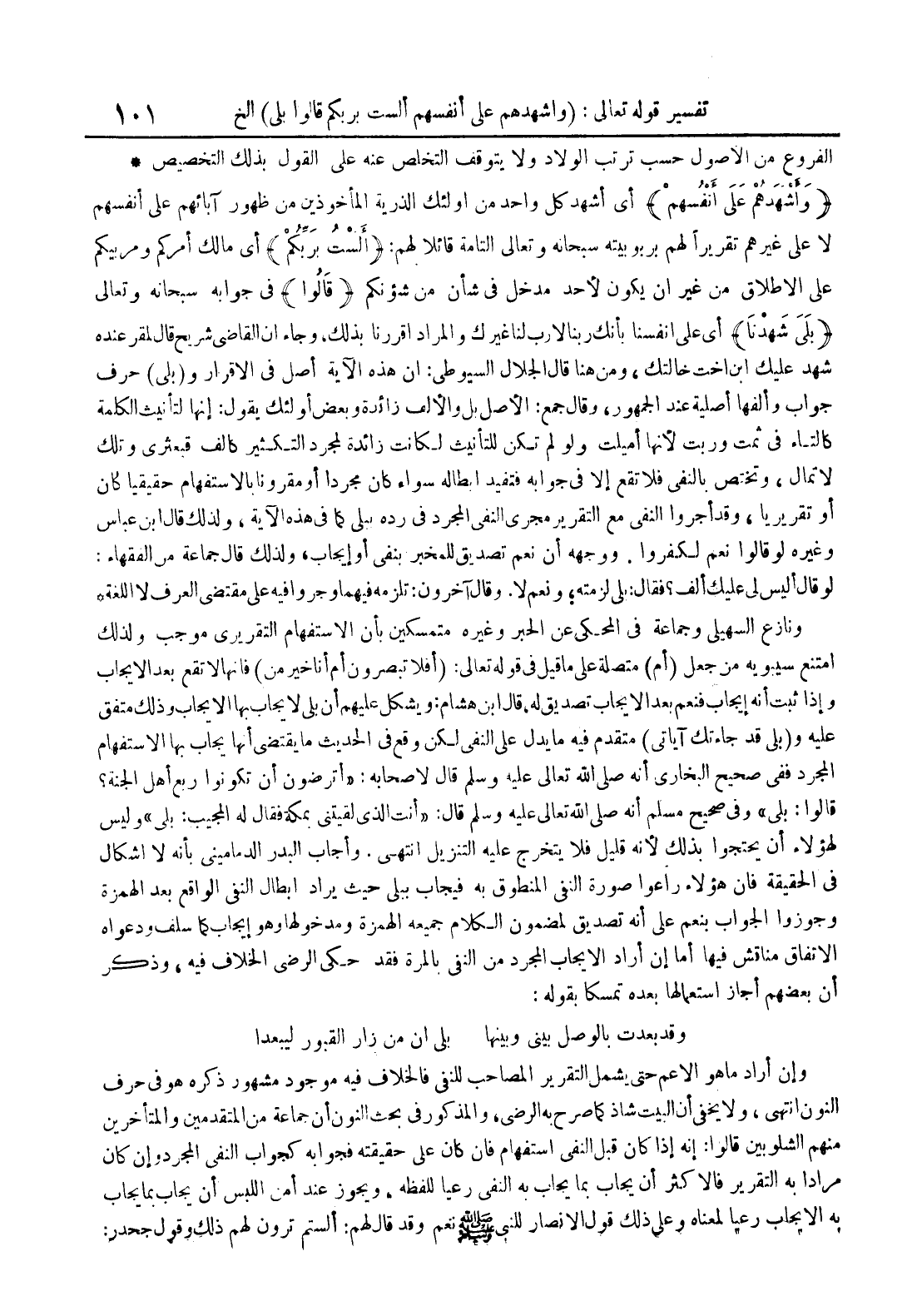 وأشهدهم على أنفسهم أي أشهد كل واحد من أولئك الذرية المأخوذين من ظهور آبائهم على أنفسهم لا على غيرهم تقريرا لهم بربوبيته سبحانه وتعالى التامة قائلا لهم : ألست بربكم أي مالك أمركم ومربيكم على الإطلاق من غير أن يكون لأحد مدخل في شأن من شؤنكم قالوا في جوابه سبحانه وتعالى بلى شهدنا أي على أنفسنا بأنك ربنا لا رب لنا غيرك والمراد أقررنا بذلك وجاء أن القاضي شريح قال لمقر عنده شهد عليك ابن أخت خالتك ومن هنا قال الجلال السيوطي : إن هذه الآية أصل في الإقرار و بلى حرف جواب وألفها أصلية عند الجمهور وقال جمع : الأصل بل والألف زائدة وبعض أولئك يقول : إنها لتأنيث الكلمة كالتاء في ثمت وربت لأنها أميلت ولو لم تكن للتأنيث لكانت زائدة لمجرد التكثير كألف قبعثرى وتلك لأتمال وتختص بالنفي فلا تقع إلا في جوابه فتفيد إبطاله سواء كان مجردا أو مقرونا بالإستفهام حقيقيا كان أو تقريريا وقد أجروا النفي مع التقرير مجرى النفي المجرد في رده ببلى كما في هذه الآية ولذلك قال ابن عباس وغيره لو قالوا نعم لكفروا ووجهه أن نعم تصديق للمخبر بنفي أو إيجاب ولذلك قال جماعة من الفقهاء : لو قال أليس لي عليك ألف فقال : بلى لزمته ونعم لا وقال آخرون : تلزمه فيهما وجروا فيه على مقتضى العرف لا اللغة