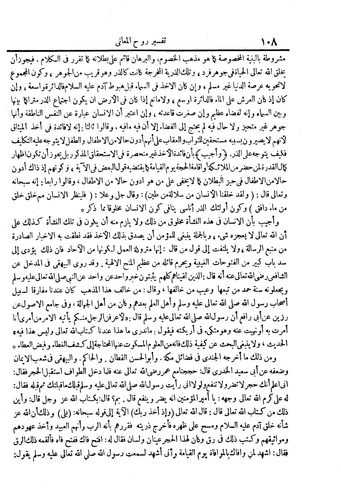 مشروطة بالبنية المخصوصة كما هو مذهب الخصوم والبرهان قائم على بطلانه كما تقرر في الكلام فيجوز أن يخلق الله تعالى الحياة في جوهر فرد وتلك الذرية المخرجة كانت كالذر وهو قريب من الجوهر وكون المجموع لا تحويه عرصة الدنيا غير مسلم وإن كان الأخذ في السماء قبل هبوط آدم عليه السلام فالدائرة واسعة وإن كان إذ كان العرش على الماء فالدائرة أوسع ولا مانع إذا كان في الأرض أن يكون إجتماع الذر متراكما بينها وبين السماء وإنه لفضاء عظيم وإن صغرت قاعدته وإن أعتبر أن الإنسان عبارة عن النفس الناطقة وأنها جوهر غير متحيز ولا حال فيه لم يحتج إلى الفضاء إلا أن فيه ما فيه وقالوا ثالثا : إنه لا فائدة في أخذ الميثاق لأنهم لا يصيرون بسببه مستحقين للثواب والعقاب على أنهم أدون حالا من الأطفال والطفل لا يتوجه عليه التكليف فكيف يتوجه على الذر وأجيب بأن فائدة الأخذ غير منحصرة في الإستحقاق المذكور بل يجوز أن تكون إظهار كمال القدرة لمن حضر من الملائكة وإقامة الحجة يوم القيامة كما يقتضيه قول البعض في الآية وكونهم إذ ذاك أدون حالا من الأطفال في حيز البطلان كما لا يخفى على من هو أدون حالا من الأطفال وقالوا رابعا : إنه سبحانه وتعالى قال : ولقد خلقنا الإنسان من سلالة من طين : وقال جل وعلا : فلينظر الإنسان مم خلق خلق من ماء دافق وكون أولئك الذر أناسي ينافي كون الإنسان مخلوقا مما ذكر
