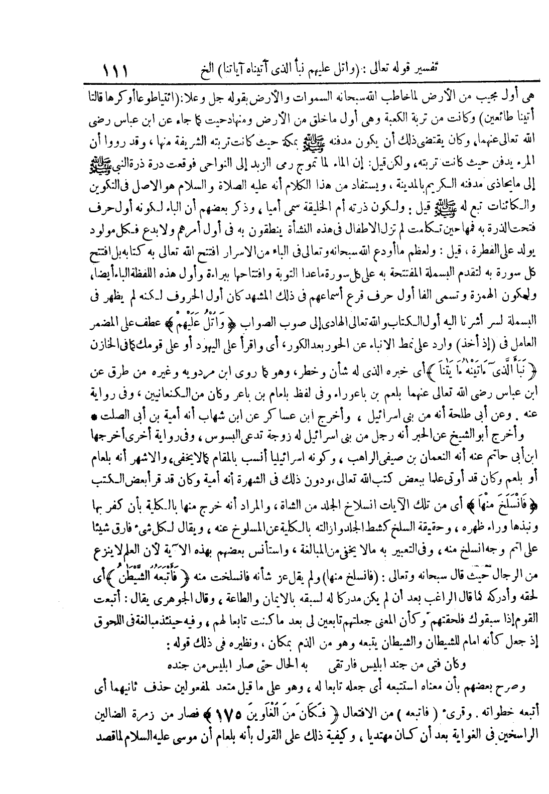 وأخرج أبو الشيخ عن الحبر أنه رجل من بني إسرائيل له زوجة تدعى البسوس وفي رواية أخرى أخرجها ابن أبي حاتم عنه أنه النعمان بن صيفي الراهب وكونه إسرائيليا أنسب بالمقام كما لا يخفى والأشهر أنه بلعام أو بلعم وكان قد أوتي علما ببعض كتب الله تعالى ودون ذلك في الشهرة أنه أمية وكان قد قرأ بعض الكتب فانسلخ منها أي من تلك الآيات إنسلاخ الجلد من الشاة والمراد أنه خرج منها بالكلية بأن كفر بها ونبذها وراء ظهره وحقيقة السلخ كشط الجلد وإزالته بالكلية عن المسلوخ عنه ويقال لكل شيء فارق شيئا على أتم وجه إنسلخ منه وفي التعبير به ما لا يخفى من المبالغة واستأنس بعضهم بهذه الآية لأن العلم لا ينزع من الرجال حيث قال سبحانه وتعالى : فانسلخ منها ولم يقل عز شأنه فانسلخت منه فأتبعه الشيطان أي لحقه وأدركه كما قال الراغب بعد أن لم يكن مدركا له لسبقه بالإيمان والطاعة وقال الجوهري يقال : أتبعت القوم إذا سبقوك فلحقتهم وكأن المعنى جعلتهم تابعين لي بعد ما كنت تابعا لهم وفيه حينئذ مبالغة في اللحوق إذ جعل كأنه إمام للشيطان والشيطان يتبعه وهو من الذم بمكان ونظيره في ذلك قوله : وكان فتى من جند إبليس فارتقى به الحال حتى صار إبليس من جنده وصرح بعضهم بأن معناه إستتبعه أي جعله تابعا له وهو على ما قيل متعد لمفعولين حذف ثانيهما أي أتبعه خطواته وقريء فاتبعه من الإفتعال فكان من الغاوين