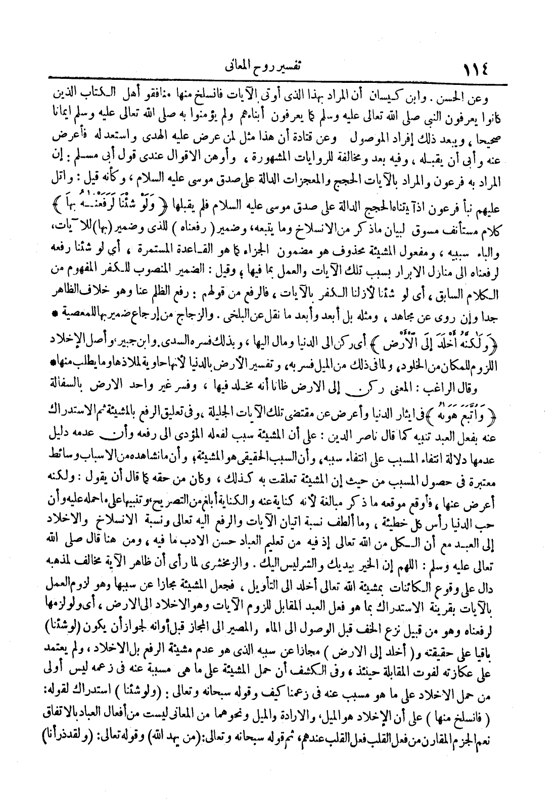 وقال الراغب : المعى ركن إلى الأرض ظانا أنه مخلد فيها وفسر غير واحد الأرض بالسفالة واتبع هواه في إيثار الدنيا وأعرض عن مقتضى تلك الآيات الجليلة وفي تعليق الرفع بالمشيئة ثم الأستدراك عنه بفعل العبد تنبيه كما قال ناصرالدين : على أن المشيئة سبب لفعله المؤدي إلى رفعه وأن عدمه دليل عدمها دلالة إنتفاء المسبب على إنتفاء سببه وأن السبب الحقيقي هو المشيئة وأن ما نشاهده من الأسباب وسائط معتبرة في حصول المسبب من حيث إن المشيئة تعلقت به كذلك وكان من حقه كما قال أن يقول : ولكنه أعرض عنها فأوقع موقعه ما ذكر مبالغة لأنه كناية عنه والكناية أبلغ من التصريح وتنبيها على ما حمله عليه وأن حب الدنيا رأس كل خطيئة وما ألطف نسبة إتيان الآيات والرفع إليه تعالى ونسبة الإنسلاخ والإخلاد إلى العبد مع أن الكل من الله تعالى إذ فيه من تعليم العباد حسن الأدب ما فيه ومن هنا قال صلى الله تعالى عليه وسلم : اللهم إن الخير بيديك والشر ليس إليك والزمخشري لما رأى أن ظاهر الآية مخالف لمذهبه دال على وقوع الكائنات بمشيئة الله تعالى أخلد إلى التأويل فجعل المشيئة مجازا عن سببها وهو لزوم العمل بالآيات بقرينة الإستدراك بما هو فعل العبد المقابل للزوم الآيات وهو الإخلاد إلى الأرض أي ولو لزمها لرفعناه وهو من قبيل نزع الخف قبل الوصول إلى الماء والمصير إلى المجاز قبل أوانه لجواز أن يكون لو شئنا باقيا على حقيقته و أخلد إلى الأرض مجازا عن سببه الذي هو عدم مشيئته الرفع بل الإخلاد ولم يعتمد على عكازته لفوت المقابلة حينئذ وفي الكشف أن حمل المشيئة على ما هي مسببة عنه في زعمه ليس أولى من حمل الإخلاد على ما هو مسبب عنه في زعمنا كيف وقوله سبحانه وتعالى : ولو شئنا إستدراك لقوله : فانسلخ منها على أن الإخلاد هو الميل والإرادة والميل ونحوهما من المعاني ليست من أفعال العباد بالإتفاق نعم الجزم المقارن من فعل القلب فعل القلب عندهم ثم قوله سبحانه وتعالى : من يهد الله وقوله تعالى : ولقد ذرأنا