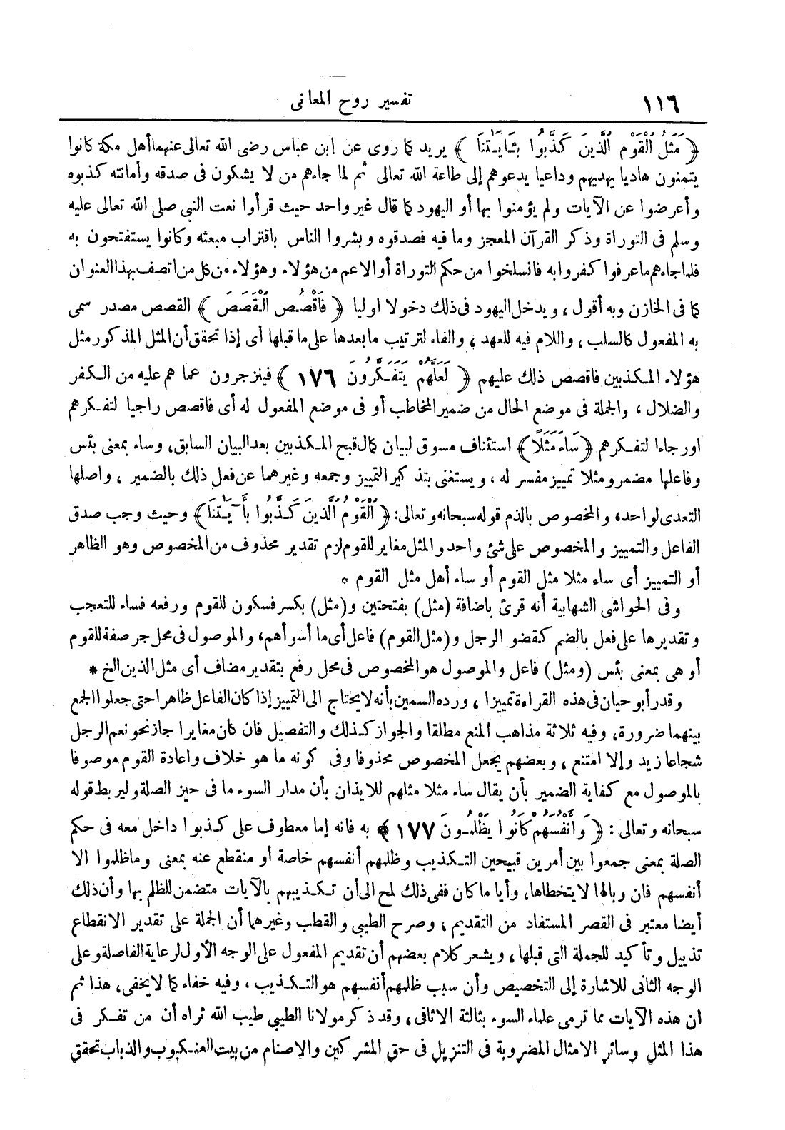 - فينزجرون عما هم عليه من الكفر والضلال والجملة في موضع الحال من ضمير المخاطب أو في موضع المفعول له أي فاقصص راجيا لتفكرهم أو رجاءا لتفكرهم ساء مثلا إستئناف مسوق لبيان كمال قبح المكذبين بعد البيان السابق وساء بمعنى بئس وفاعلها مضمر ومثلا تمييز مفسر له ويستغنى بتذكير التمييز وجمعه وغيرهما عن فعل ذلك بالضمير وأصلها التعدي لواحد والمخصوص بالذم قوله سبحانه وتعالى : القوم الذين كذبوا بآياتنا وحيث وجب صدق الفاعل والتمييز والمخصوص على شيء واحد والمثل مغاير للقوم لزم تقدير محذوف من المخصوص وهو الظاهر أو التمييز أي ساء مثلا مثل القوم أو ساء أهل مثل القوم