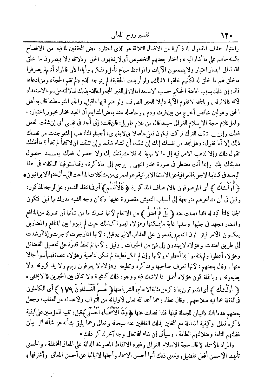 وإعتبار حذف المفعول لما ذكرنا من الأفعال الثلاثة هو الذي إختاره بعض المحققين لما فيه من الإفصاح بكنه حالهم على ما أشار إليه واختار بعضهم التخصيص أي لا يفقهون الحق ودلائله ولا يبصرون ما خلق الله تعالى أبصار إعتبار ولا يسمعون الآيات والمواعظ سماع تأمل وتفكر وأيا ما كان فالمراد أنهم لم يصرفوا ما خلق لهم لمل خلق له فكأنهم خلقوا كذلك ولو أريدت الحقيقة لم يتوجه الذم ولم تقم الحجة ومن ادعاها قال : إن ذلك بسبب إفاضة الحكيم حسب الإستعداد الأزلي الغير المجعول فالذم بذلك لدلالته على سوء الإستعداد لأنه كالأثر له وبالجملة لا تقوم الآية دليلا للجبر الصرف ولو ضم إليها ما قبل والجبر المتوسط مما قال به أهل الحق وهو لبن خالص أخرج من بين فرث ودم وحاصله عند بعض المشايخ أن العبد مختار مجبور بإختياره ولعل كلام حجة الإسلام الغزالي حيث قال من كلام طويل : فإن قلت : إني أجد في نفسي أني إن شئت الفعل فعلت وإن شئت الترك تركت فيكون فعلي حاصلا بي لا بغيري أجبنا وقلنا : هب إنك وجدت من نفسك ذلك إلا أنا نقول : وهل تجد من نفسك إنك إن شئت أن تشاء شئت وإن شئت أن لا تشأ لم تشأ ما أظنك تقول ذلك وإلا لذهب الأمر فيه إلى ما لا نهاية له فلا مشيئتك بك ولا حصول فعلك بعد حصول مشيئتك بك وإنما أنت مضطر في صورة مختار انتهى يرجع إلى ما ذكرنا وقد إستوفينا الكلام في هذا البحث في كتابنا الأجوبة العراقية عن الأسئلة الإيرانية وهو لعمري من مشكلات المباحث التي سأل عنها الإيرانيون
