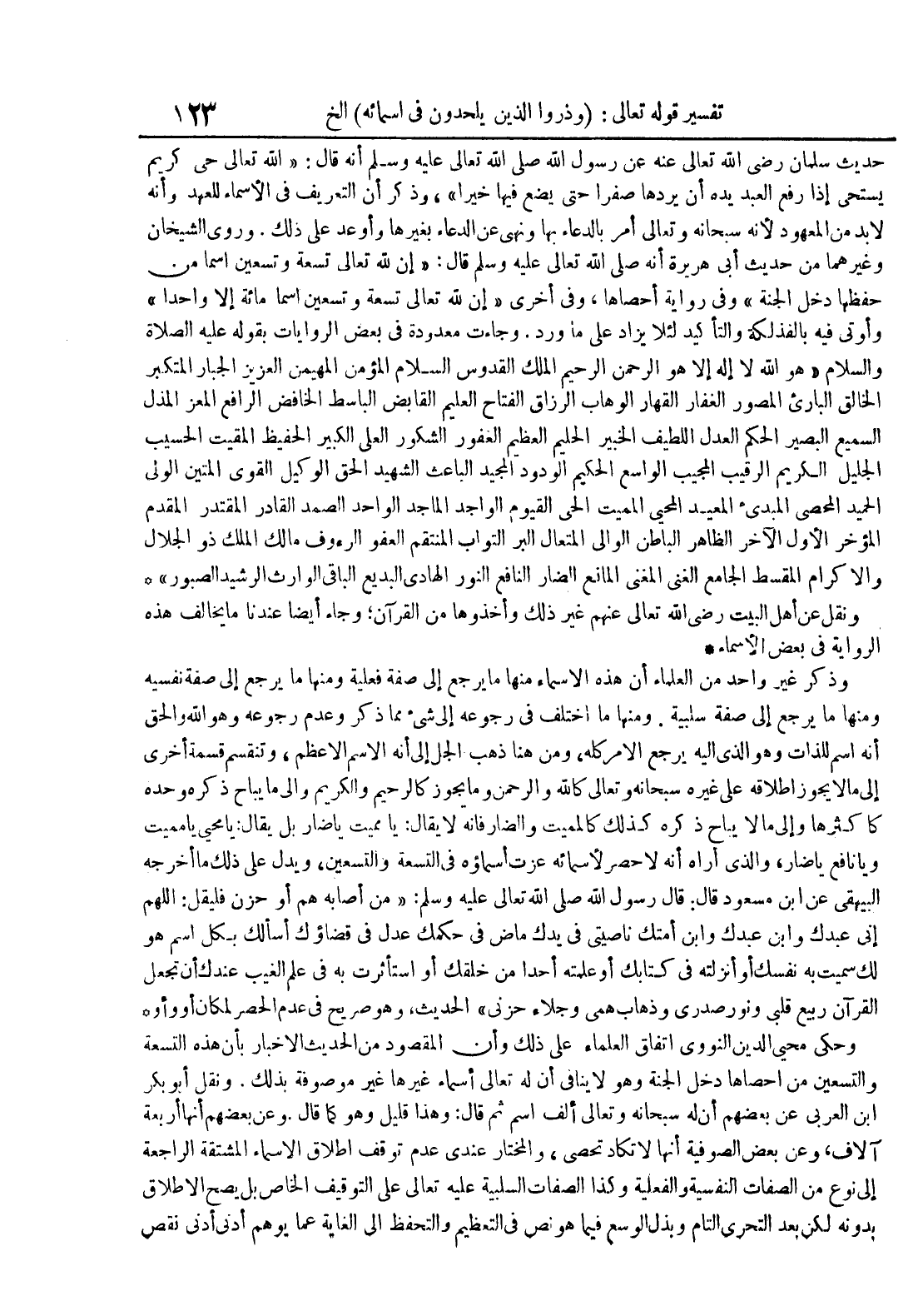 حديث سلمان رضي الله تعالى عنه عن رسول الله صلى الله تعالى عليه وسلم أنه قال : الله تعالى حي كريم يستحي إذا رفع العبد يده أن يردها صفرا حتى يضع فيها خيرا وذكر أن التعريف في الأسماء للعهد وأنه لابد من المعهود لأنه سبحانه وتعالى أمر بالدعاء بها ونهى عن الدعاء بغيرها وأوعد على ذلك وروى الشيخان وغيرهما من حديث أبي هريرة أنه صلى الله تعالى عليه وسلم قال : إن لله تسعة وتسعين إسما من حفظها دخل الجنة وفي رواية أحصاها وفي أخرى إن لله تعالى تسعة وتسعين إسما مائة إلا واحدا وأوتي فيه بالفذلكة والتأكيد لئلا يزاد على ما ورد وجاءت معدودة في بعض الرويات بقوله عليه الصلاة و السلام هو الله لا إله إلا هو الرحمن الرحيم الملك القدوس السلام المؤمن المهيمن العزيز الجبار المتكبر الخالق الباريء المصور الغفار القهار الوهاب الرزاق الفتاح العليم القابض الباسط الخافض الرافع المعز المذل السميع البصير الحكم العدل اللطيف الخبير الحليم العظيم الغفور الشكور العلي الكبير الحفيظ المقيت الحسيب الجليل الكريم الرقيب المجيب الواسع الحكيم الودود المجيد الباعث الشهيد الحق الوكيل القوي المتين الولي الحميد المحصي المبديء المعيد المحيي المميت الحي القيوم الواجد الماجد الواحد الصمد القادر المقتدر المقدم المؤخر الأول الآخر الظاهر الباطن الوالي المتعال البر التواب المنتقم العفو الرءوف مالك الملك ذو الجلال والإكرام المقسط الجامع الغني المغني المانع الضار النافع النور الهادي البديع الباقي الوارث الرشيد الصبور