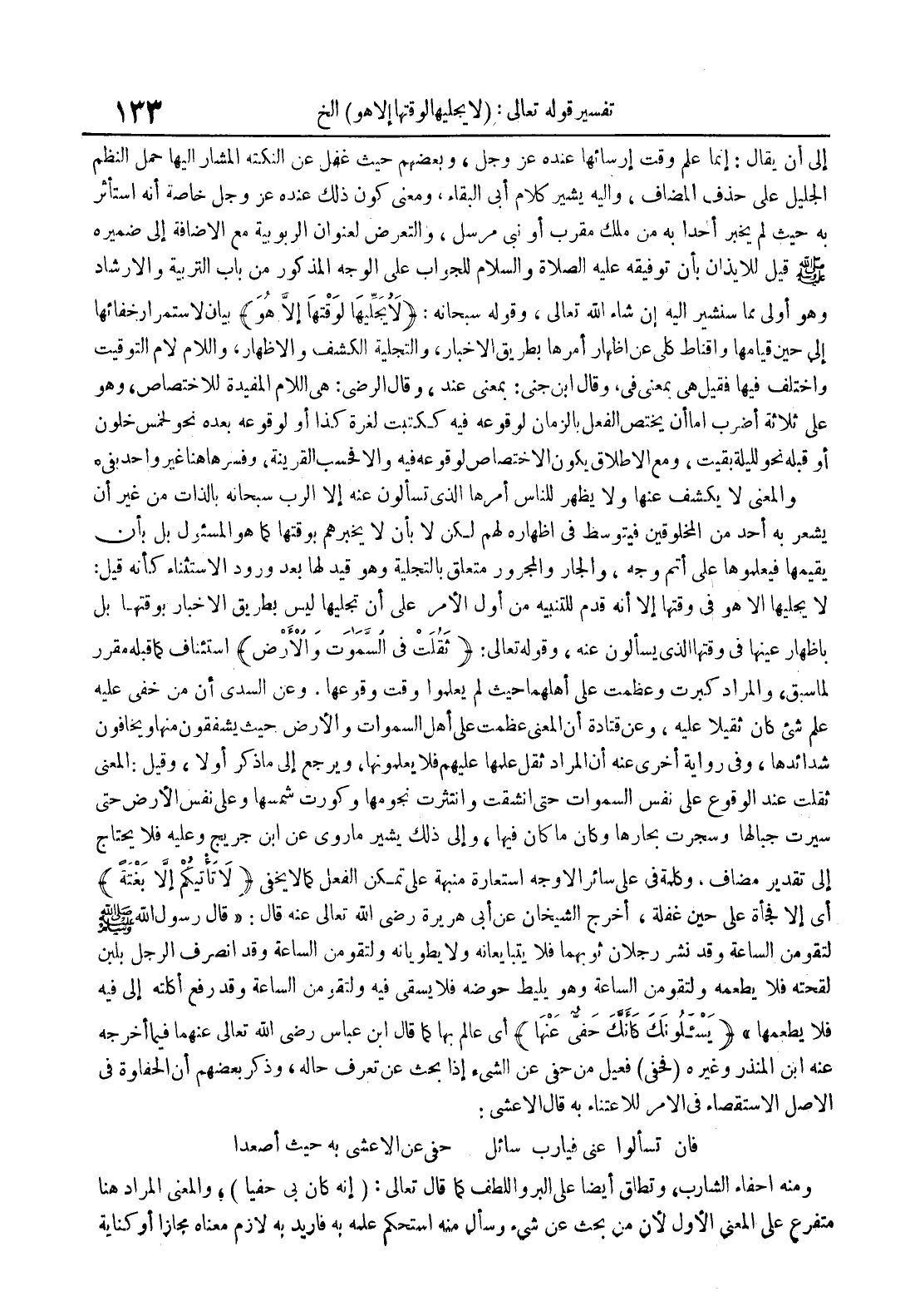 والمعنى لا يكشف عنها ولا يظهر للناس أمرها الذي تسألون عنه إلا الرب سبحانه بالذات من غير أن يشعر به أحد من المخلوقين فيتوسط في إظهاره لهم لكن لا بأن لا يخبرهم بوقتها كما هو المسئول بل بأن يقيمها فيعلموها على أتم وجه والجار والمجرور متعلق بالتجلية وهو قيد لها بعد ورود الإستثناء كأنه قيل : لا يجليها إلا هو في وقتها إلا أنه قدم للتنبيه من أول الأمر على أن تجليها ليس بطريق الإخبار بوقتها بل بإظهار عينها في وقتها الذي يسألون عنه وقوله تعالى : ثقلت في السموات والأرض إستئناف كما قبله مقرر لما سبق والمراد كبرت وعظمت على أهلهما حيث لم يعلموا وقت وقوعها وعن السدي أن من خفي عليه علم شيء كان ثقيلا عليه وعن قتادة أن المعنى عظمت على أهل السموات والأرض حيث يشفقون منها ويخافون شدائدها وفي رواية أخرى عنه أن المراد ثقل علمها عليهم فلا يعلمونها ويرجع إلى ما ذكر أولا وقيل : المعنى ثقلت عند الوقوع على نفس السموات حتى إنشقت وانتثرت نجومها وكورت شمسها وعلى نفس الأرض حتى سيرت جبالها وسجرت بحارها وكان ما كان فيها وإلى ذلك يشير ما روي عن ابن جريج وعليه فلا يحتاج إلى تقدير مضاف وكلمة على سائر الأوجه إستعارة منبهة على تمكن الفعل كما لا يخفى لا تأتيكم إلا بغتة أي إلا فجأة على حين غفلة أخرج الشيخان عن أبي هريرة رضي الله تعالى عنه قال : قال رسول الله صلى الله تعالى عليه وسلم لتقومن الساعة وقد نشر رجلان ثوبهما فلا يتبايعانه ولا يطويانه ولتقومن الساعة وقد إنصرف الرجل بلبن لقحته فلا يطعمه ولتقومن الساعة وهو يليط حوضه فلا يسقي فيه ولتقومن الساعة وقد رفع أكلته إلى فيه فلا يطعمها يسئلونك كأنك حفي عنها أي عالم بها كما قال ابن عباس رضي الله تعالى عنهما فيما أخرجه عنه ابن المنذر وغيره فحفي فعيل من حفي عن الشيء إذا بحث عن تعرف حاله وذكر بعضهم أن الحفاوة في الأصل الإستقصاء في الأمر للإعتناء به قال الأعشى : فإن تسألوا عني فيارب سائل حفي عن الأعشى به حيث أصعدا ومنه أحفاء الشارب وتطلق أيضا على البر واللطف كما قال تعالى : إنه كان حفيا والمعنى المراد هنا متفرع على المعنى الأول لأن من بحث عن شيء وسأل منه إستحكم علمه به فأريد به لازم معناه مجازا أو كناية