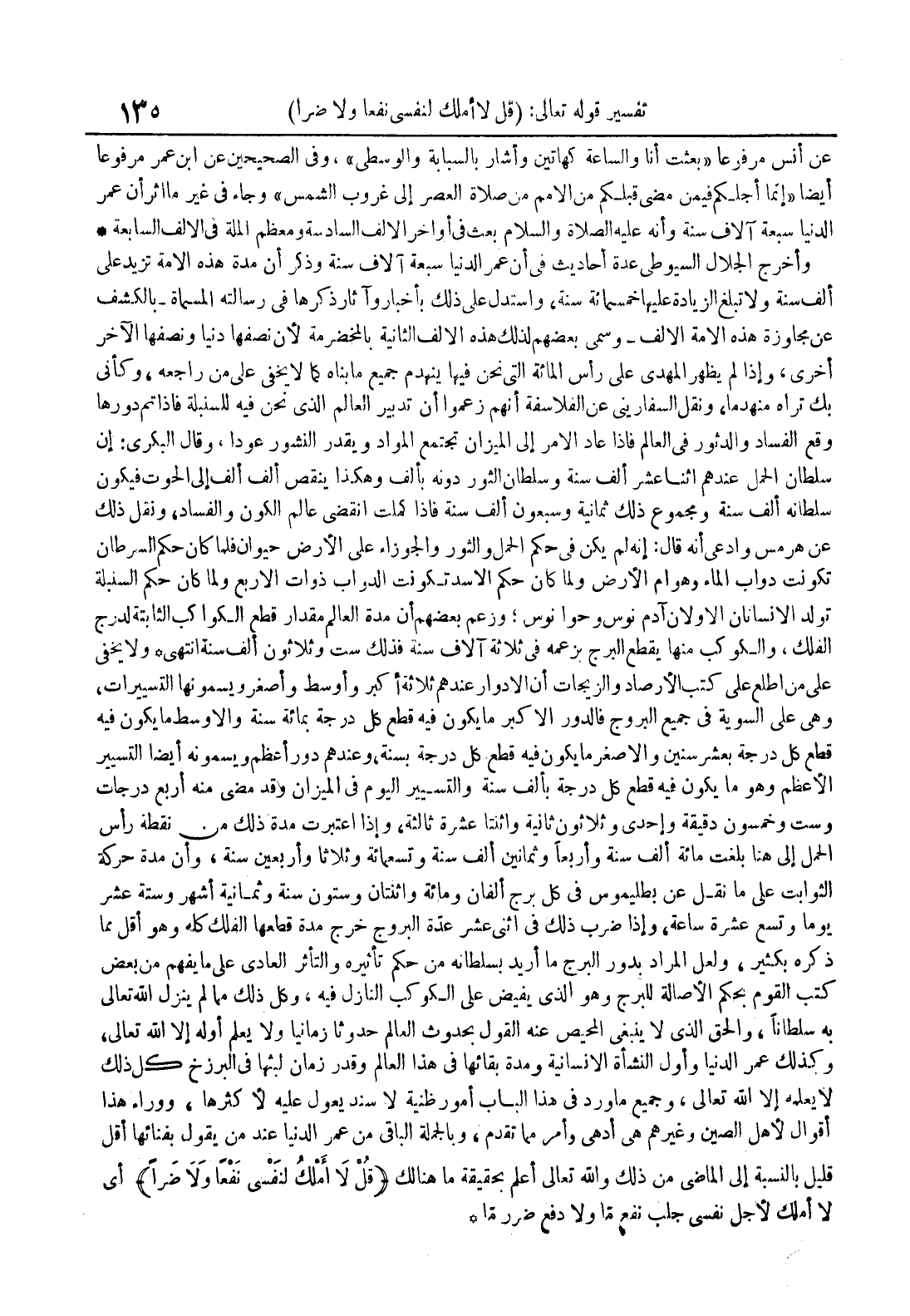 ولا يخفى على من اطلع على كتب الإرصاد والزيجات أن الأدوار عندهم ثلاثة أكبر وأوسط وأصغر ويسمونها التسييرات وهي على السوية في جميع البروج فالدور الأكبر ما يكون في قطع كل درجة بمائة سنة والأوسط ما يكون فيه قطع كل درجة بعشر سنين والأصغر ما يكون فيه قطع كل درجة سنة وعندهم دور أعظم ويسمونه أيضا التسيير الأعظم وهو ما يكون فيه قطع كل درجة بألف سنة والتسيير اليوم في الميزان وقد مضى منه أربع درجات وست وخمسون دقيقة وإحدى وثلاثون ثانية وإثنتا عشرة ثالثة وإذا أعتبرت مدة ذلك من نقطة رأس الحمل إلى هنا بلغت مائة ألف سنة وأربعا وثمانين ألف سنة وتسعمائة وثلاثا وأربعين سنة وأن مدة حركة الثوابت على ما نقل عن بطليموس في كل برج ألفان ومائة وإثنتان وستون سنة وثمانية أشهر وستة عشر يوما وتسع عشرة ساعة وإذا ضرب ذلك في إثني عشر عدة البروج خرج مدة قطعها الفلك كله وهو أقل مما ذكره بكثير ولعل المراد بدور البرج ما أريد بسلطانه من حكم تأثيره والتأثر العادي على ما يفهم من بعض كتب القوم بحكم الأصالة للبرج وهو الذي يفيض على الكواكب النازل فيه وكل ذلك ما لم ينزل الله تعالى به سلطانا والحق الذي لا ينبغي المحيص عنه القول بحدوث العلم حدوثا زمانيا ولا يعلم أوله إلا الله تعالى وكذلك عمر الدنيا وأول النشأة الإنسانية ومدة بقائها في هذا العالم وقدر زمان لبثها في البرزخ كل ذلك لا يعلمه إلا الله تعالى وجميع ما ورد في هذا الباب أمر ظنية لا سند يعول عليه لأكثرها ووراء هذا أقول لأهل الصين وغيرهم هي أدهى وأمر مما تقدم وبالجملة الباقي من عمر الدنيا عند من يقول بفنائها أقل قليل بالنسبة إلى الماضي من ذلك والله تعالى أعلم بحقيقة ما هنالك قل لا أملك لنفسي نفعا ولا ضرا أي لا أملك لأجل نفسي جلب نفع ما ولا دفع ضرر ما