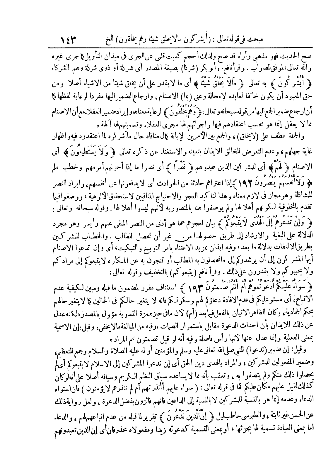 صح الحديث فهو مذهبي وأراه قد صح ولذلك أحجم كميت قلمي عن الجري في ميدان التأويل كما جرى غيره والله تعالى الموفق للصواب وقرأ نافع وأبوبكر شركا بصيغة المصدر أي شركة أو ذوي شركة وهم الشركاء أيشركون به تعالى ما لا يخلق شيئا أي ما لا يقدر على أن يخلق شيئا من الأشياء أصلا ومن حق المعبود أن يكون خالقا لعابده لا محالة وعنى بما الأصنام وإرجاع الضمير إليها مفردا لرعاية لفظها كما أن إرجاع ضمير الجمع إليها من قوله سبحانه وتعالى : وهم يخلقون لرعاية معناها وإيراد ضمير العقلاء مع أن الأصنام مما لا يعقل إنما هو بحسب إعتقادهم فيها وإجرائهم لها مجرى العقلاء وتسميتهم لها آلهة