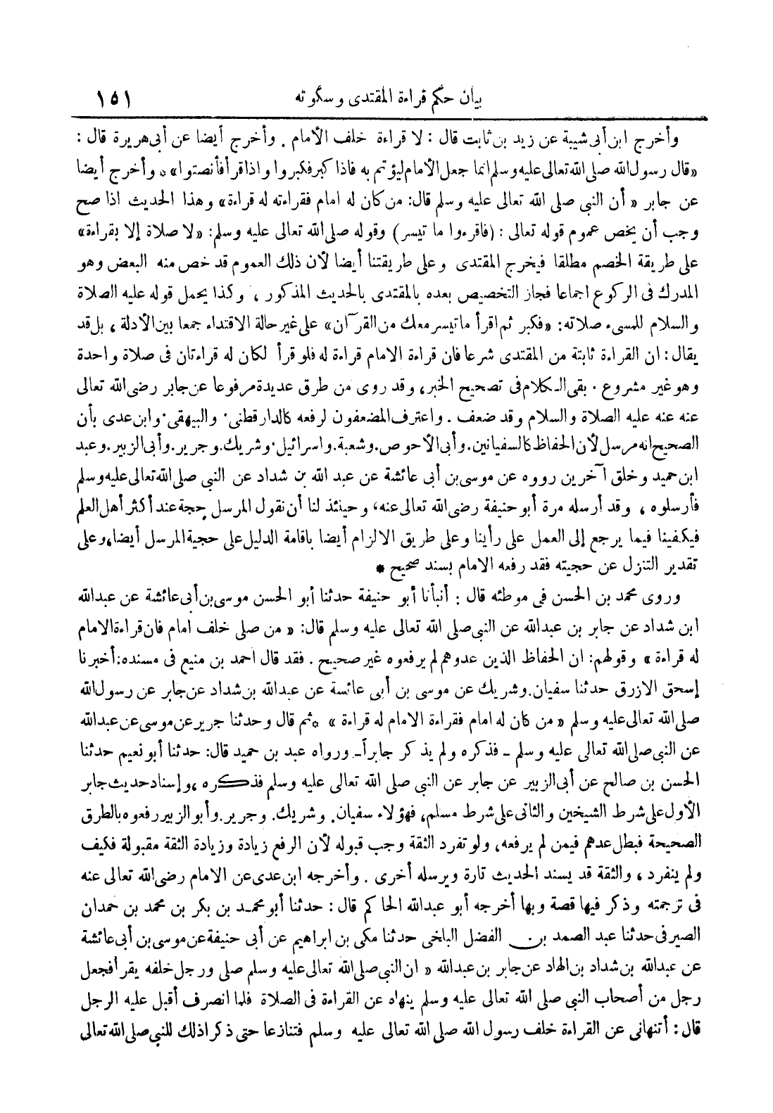 ثم قال وحدثنا جرير عن موسى عن عبدالله عن النبي صلى الله تعالى عليه وسلمفذكره ولم يذكر جابرا ورواه عبد بن حميد قال : حدثنا أبو نعيم حدثنا الحسن بن صالح عن أبي الزبير عن جابر عن النبي صلى الله تعالى عليه وسلم فذكره وإسناد حديث جابر الأول على شرط الشيخين والثاني على شرط مسلم فهؤلاء سفيان وشريك وجرير وأبو الزبير ورفعوه بالطرق الصحيحة فبطل عدهم فيمن لم يرفعه ولو تفرد الثقة وجب قبوله لأن الرفع زيادة وزيادة الثقة مقبولة فكيف ولم ينفرد والثقة قد يسند الحديث تارة ويرسله أخرى وأخرجه ابن عدي عن الإمام رضي الله تعالى عنه في ترجمته وذكر فيها قصة وبها أخرجه أبو عبدالله الحاكم قال : حدثنا أبومحمد بن بكر بن محمد بن حمدان الصيرفي حدثنا عبدالصمد بن الفضل البلخي حدثنا مكي بن إبراهيم عن أبي حنيفة عن موسى بن أبي عائشة عن عبدالله بن شداد بن الهاد عن جابر بن عبدالله أن النبي صلى الله تعالى عليه وسلم صلى ورجل خلفه يقرأ فجعل رجل من أصحاب النبي صلى الله تعالى عليه وسلم ينهاه عن القراءة في الصلاة فلما انصرف أقبل عليه الرجل قال : أتنهاني عن القراءة خلف رسول الله صلى الله تعالى عليه وسلم فتنازعا حتى ذكرا ذلك للنبي صلى الله تعالى