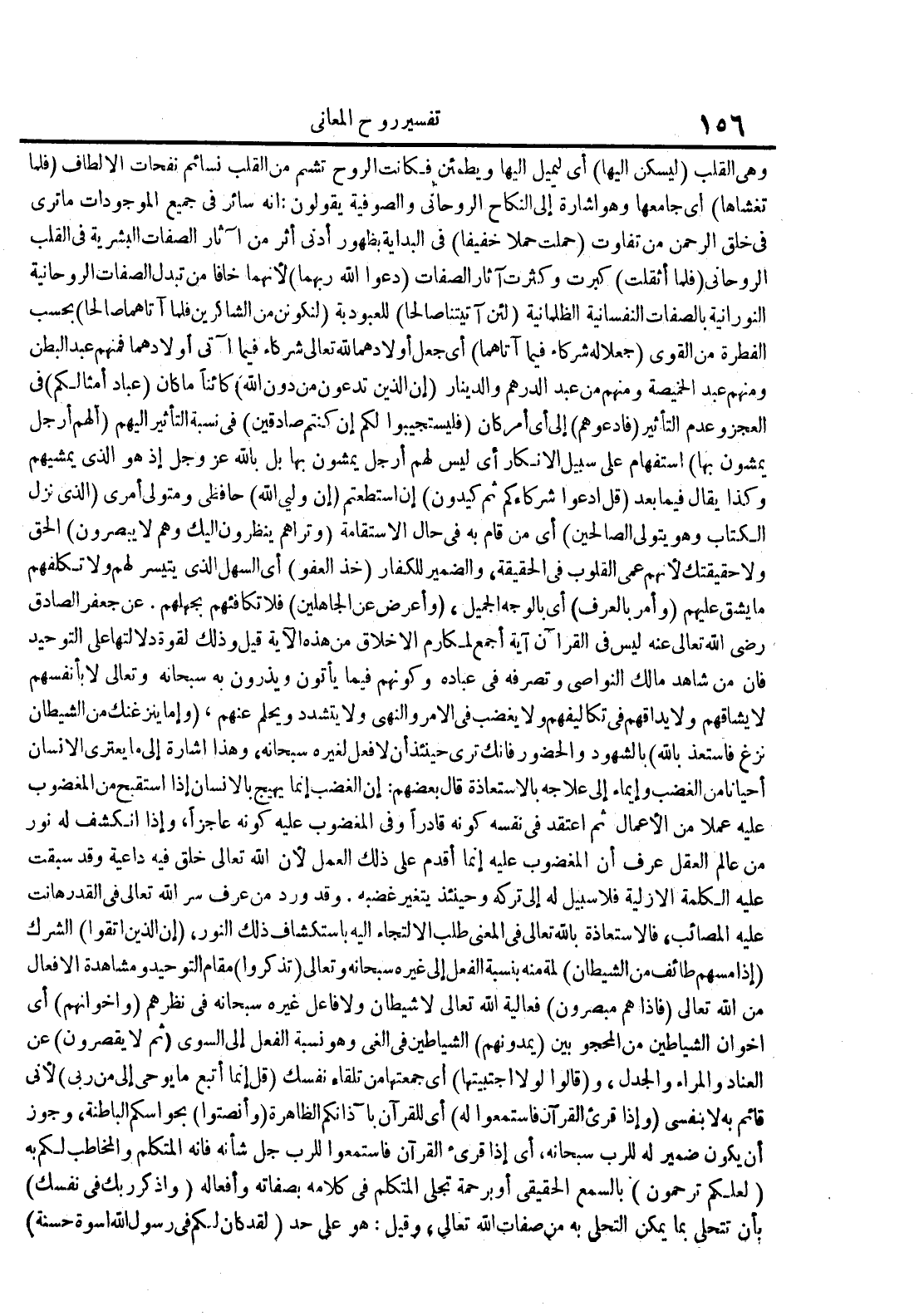 وهي القلب ليسكن إليها أي ليميل إليها ويطمئن فكانت الروح تشم من القلب نسائم نفحات الألطاف فلما تغشاها أي جامعها وهو إشارة إلى النكاح الروحاني والصوفية يقولون : إنه سائر في جميع الموجودات ما ترى في خلق الرحمن من تفاوت حملت حملا خفيفا في البداية بظهور أدنى أثر من آثار الصفات البشرية في القلب الروحاني فلما أثقلت كبرت وكثرت آثار الصفات دعوا الله ربهما لأنهما خافا من تبدل الصفات الروحانية النورانية بالصفات النفسانية الظلمانية لئن آتيتنا صالحا للعبودية لنكونن من الشاكرين فلما آتاهما صالحا بحسب الفطرة من القوى جعلا له شركاء فيما آتاهما أي جعل أولادهما لله تعالى شركاء فيما آتى أولادهما فمنهم عبد البطن ومنهم عبد الخميصة ومنهم عبد الدرهم والدينار إن الذين تدعون من دون الله كائنا ما كان عبادا أمثالكم في العجز وعدم التأثير فادعوهم إلى أي أمر كان فليستجيبوا لكم إن كنتم صادقين في نسبة التأثير إليهم ألهم أرجل يمشون بها إستفهام على سبيل الإنكار أي ليس لهم أرجل يمشون بها بل الله عز و جل إذ هو الذي يمشيهم وكذا يقال فيما بعد قل ادعوا شركاءكم ثم كيدون إن إستطعتم إن وليي الله حافظي ومتولي أمري الذي نزل الكتاب وهو يتولى الصالحين أي من قام به في حال الإستقامة وتراهم ينظرون إليك وهم لايبصرون الحق ولا حقيقتك لأنهم عمي القلوب في الحقيقة والضمير للكفار خذ العفو أي السهل الذي يتيسر لهم ولا تكلفهم ما يشق عليهم وأمر بالعرف أي بالوجه الجميل وأعرض عن الجاهلين فلا تكافئهم بجهلهم عن جعفر الصادق رضي الله تعالى عنه ليس في القرآن آية أجمع لمكارم الأخلاق من هذه الآية قيل وذلك لقوة دلالتها على التوحيد فإن من شاهد مالك النواصي وتصرفه في عباده وكونهم فيما يأتون ويذرون به سبحانه وتعالى لا بأنفسهم لا يشاقهم ولا يداقهم في تكاليفهم ولا يغضب في الأمر والنهي ولا يتشدد ويحلم عنهم وإما ينزغنك من الشيطان نزغ فاستعذ بالله بالشهود والحضور فإنك ترى حينئذ أن لا فعل لغيره سبحانه وهذا إشارة إلى ما يعتري الإنسان أحيانا من الغضب وإيماء إلى علاجه بالإستعاذة قال بعضهم : إن الغضب إنما يهيج بالإنسان إذا إستقبح من المغضوب عليه عملا من الأعمال ثم إعتقد في نفسه كونه قادرا وفي المغضوب عليه كونه عاجزا وإذا إنكشف له نور من عالم العقل عرف أن المغضوب عليه إنما أقدم على ذلك العمل لأن الله تعالى خلق فيه داعية وقد سبقت عليه الكلمة الأزلية فلا سبيل له إلى تركه وحينئذ يتغير غضبه وقد ورد من عرف سر الله تعالى في القدر هانت عليه المصائب فالإستعاذة بالله تعالى في المعنى طلب الإلتجاء إليه بإستكشاف ذلك النور إن الذين اتقوا الشرك إذا مسهم طائف من الشيطان لمة منه بنسبة الفعل إلى غيره سبحانه وتعالى تذكروا مقام التوحيد ومشاهدة الأفعال من الله تعالى فإذا هم مبصرون فعالية الله تعالى لا شيطان ولا فاعل غيره سبحانه في نظرهم وإخوانهم أي إخوان الشياطين من المحجوبين يمدونهم الشياطين في الغي وهو نسبة الفعل إلى السوي ثم لا يقصرون عن العناد والمراء والجدل و قالوا لولا إجتبيتها أي جمعتها من تلقاء نفسك قل إنما أتبع ما يوحى إلي من ربي لأني قائم به لا بنفسي وإذا قريء القرآن فاستمعوا له أي القرآن بآذانكم الظاهرة وأنصتوا بحواسكم الباطنة وجوز أن يكون ضمير له للرب سبحانه أي إذا قريء القرآن فاستمعوا للرب جل شأنه فإنه المتكلم والمخاطب لكم به لعلكم ترحمون بالسمع الحقيقي أو برحمة تجلي المتكلم في كلامه بصفاته وأفعاله واذكر ربك في نفسك بأن تتحلى بما يمكن التحلي به من صفات الله تعالى وقيل : هو على حد لقد كان لكم في رسول الله أسوة حسنة