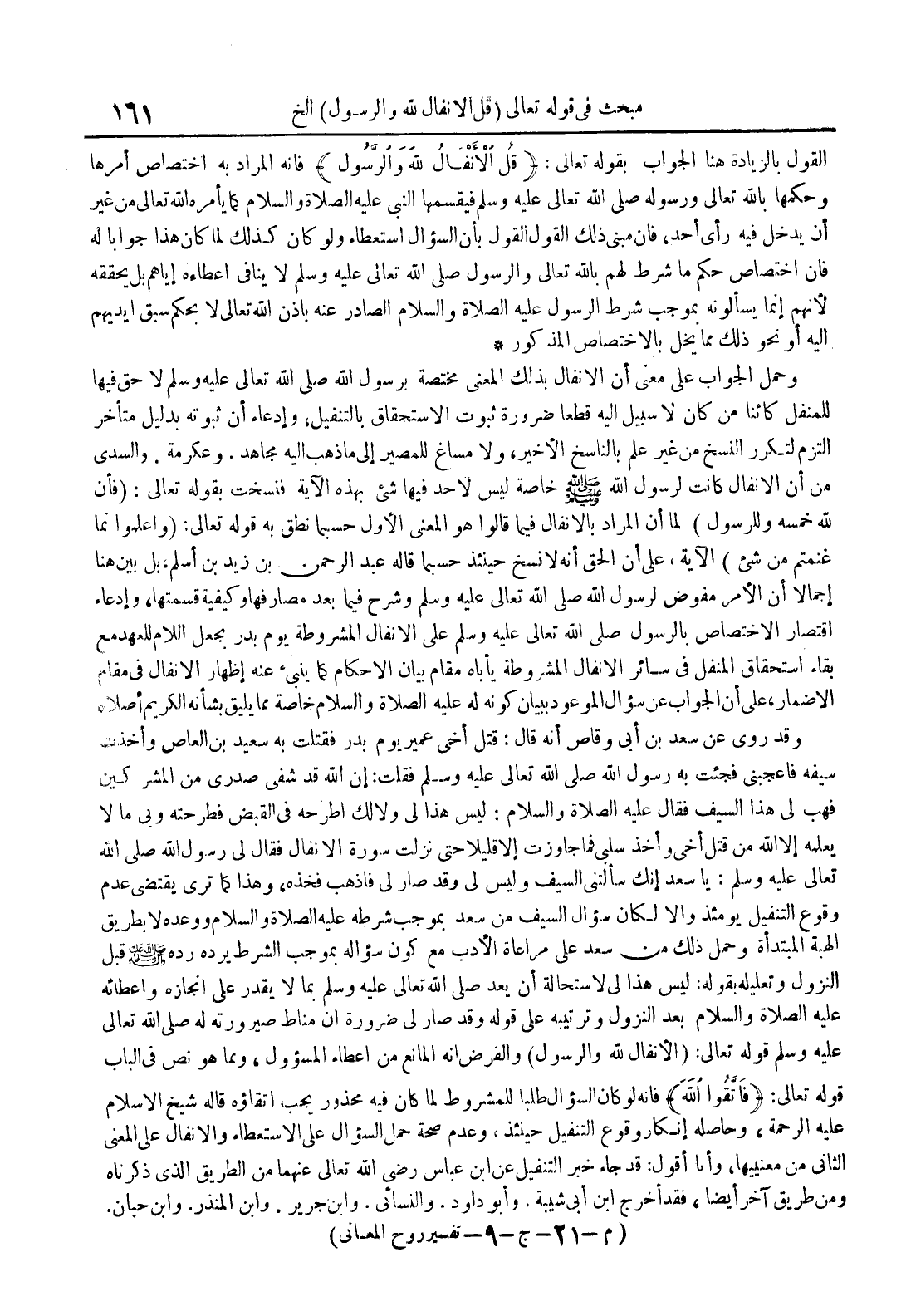 وقد روي عن سعد بن أبي وقاص أنه قال : قتل أخي عمير يوم بدر فقتلت به سعيد بن العاص وأخذت سيفه فأعجبني فجئت به رسول الله صلى الله تعالى عليه وسلم فقلت : إن الله قد شفى صدري من المشركين فهب لي هذا السيف فقال عليه الصلاة و السلام : ليس هذا لي ولا لك اطرحه في القبض فطرحته وبي ما لا يعلمه إلا الله من قتل أخي وأخذ سلبي فما جاوزت إلا قليلا حتى نزلت سورة الأنفال فقال لي رسول الله صلى الله تعالى عليه وسلم : يا سعد إنك سألتني السيف وليس لي وقد صار لي فاذهب فخذه وهذا كما ترى يقتضي عدم وقوع التنفيل يومئذ وإلا لكان سؤال السيف من سعد بموجب شرطه عليه الصلاة و السلام ووعده لا بطريق الهبة المبتدأة وحمل ذلك من سعد على مراعاة الأدب مع كون سؤاله بموجب الشرط يرده رده صلى الله تعالى عليه وسلم قبل النزول وتعليله بقوله : ليس هذا لي لإستحالة أن يعد صلى الله تعالى عليه وسلم بما لا يقدر على إنجازه وإعطائه عليه الصلاة و السلام بعد النزول وترتيبه على قوله وقد صار لي ضرورة أن مناط صيرورته له صلى الله تعالى عليه وسلم قوله تعالى : الأنفال لله والرسول والفرض أنه المانع من إعطاء المسؤول ومما هو نص في الباب قوله تعالى : فاتقوا الله فإنه لو كان السؤال طلبا للمشروط لما كان فيه محذور يجب إتقاؤه قاله شيخ الإسلام عليه الرحمة وحاصله إنكار وقوع التنفيل حينئذ وعدم صحة حمل السؤال على الإستعطاء والأنفال على المعنى الثاني من معنييها وأنا أقول : قد جاء خبر التنفيل عن ابن عباس رضي الله تعالى عنهما من الطريق الذي ذكرناه ومن طريق آخر أيضا فقد أخرج ابن أبي شيبة وأبو داود والنسائي وابن جرير وابن المنذر وابن حبان