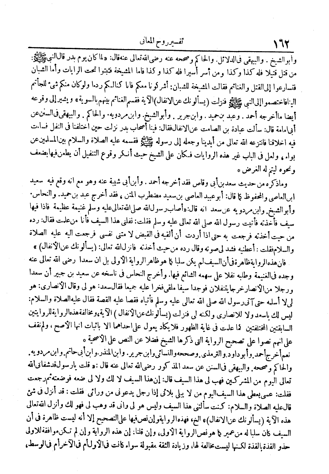 وما ذكره من حديث سعد بن أبي وقاص فقد أخرجه أحمد وابن أبي شيبة عنه وهو مع أنه وقع فيه سعيد ابن العاصي والمحفوظ كما قال : أبو عبيد العاصي بن سعيد مضطرب المتن فقد أخرج عبد بن حميد والنحاس وأبو الشيخ وابن مردويه عن سعد أنه قال : أصاب رسول الله صلى الله تعالى عليه وسلم غنيمة عظيمة فإذا فيها سيف فأخذته فأتيت رسول الله صلى الله تعالى عليه وسلم فقلت : نفلني هذا السيف فأنا من علمت فقال : رده من حيث أخذته فرجعت به حتى إذا أردت أن ألقيه في القبض لامتني نفسي فرجعت إليه عليه الصلاة و السلام فقلت : أعطنيه فشد لي صوته وقال رده من حيث أخذته فأنزل الله تعالى : يسألونك عن الأنفال فإن هذه الرواية طاهرة في أن السيف لم يكن سلبا كما هو ظاهر الرواية الأولى بل أن سعدا رضي الله تعالى عنه وجده في الغنيمة وطلبه نفلا على سهمه الشائع فيها وأخرج النحاس في ناسخه عن سعيد بن جبير أن سعدا ورجلا من الأنصار خرجا يتنفلان فوجدا سيفا ملقى فخرا عليه جميعا فقال سعد : هو لي وقال الأنصاري هو لي لا أسلمه حتى آتي رسول الله صلى الله تعالى عليه وسلم فأتياه فقصا عليه القصة فقال عليه الصلاة و السلام : ليس لك يا سعد ولا للأنصاري ولكنه لي فنزلت يسألونك عن الأنفال الآية ومخالفة هذه الرواية للروايتين السابقتين المختلفتين كما علمت في غاية الظهور فلا يكاد يعول على إحداهما إلا بإثبات أنها الأصح ولم تقف على أنهم نصوا على تصحيح الرواية التي ذكرها الشيخ فضلا عن النص على الأصحية