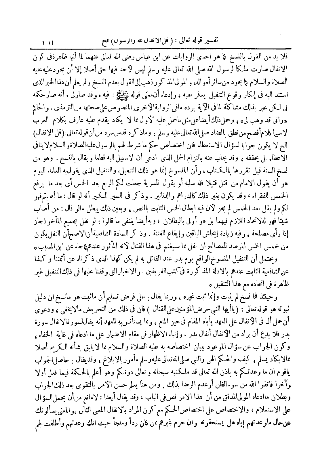 وحينئذ فما نسخ لم يثبت وإنما ثبت غيره وربما يقال : على فرض تسليم أن ما ثبت هو ما نسخ أن دليل ثبوته هو قوله تعالى : يا أيها النبي حرض المؤمنين على القتال فإن ذلك من التحريض ما لا يخفى ودعوى أن حمل أل في الأنفال على العهد يأباه المقام في حيز المنع ومما يستأنس به للعهد أنه يقال لسورة الأنفال سورة بدر فلا يدع أن يراد من الأنفال أنفال بدر وإنباء الإظهار في مقام الإضمار على ما إدعاه في غاية الخفاء وكون الجواب عن سؤال الموعود ببيان إختصاصه به عليه الصلاة و السلام مما لا يليق بشأنه الكريم أصلا مما لا يكاد يسلم كيف والحكم إلهي والنبي صلى الله تعالى عليه وسلم مأمور بالإبلاغ وقد يقال : حاصل الجواب يا قوم إن ما وعدتكم به بإذن الله تعالى قد ملكنيه سبحانه وتعالى دونكم وهو أعلم بالحكمة فيما فعل أولا وآخرا فاتقوا الله من سوء الظن أو عدم الرضا بذلك ومن هنا يعلم حسن الأمر بالتقوى بعد ذلك الجواب وبطلان ما إدعاه المولى المدقق من أن هذا الأمر نص في الباب وقد يقال أيضا : لا مانع من أن يحمل السؤال على الإستعلام والإختصاص على إختصاص الحكم مع كون المراد بالأنفال المعنى الثاني والمعنى يسألونك عن حال ما وعدتهم إياه هل يستحقونه وإن حرم غيرهم ممن كان ردا وملجأ حيث إنك وعدتهم وأطلقت لهم