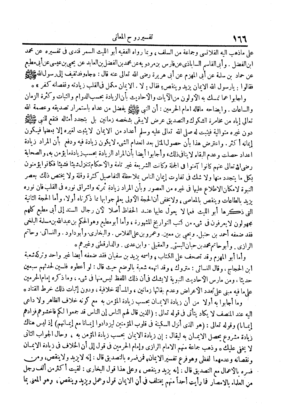 على ما ذهب إليه القلانسي وجماعة من السلف وبما رواه الفقيه أبو الليث السمرقندي في تفسيره عن محمد ابن الفضل وأبي القاسم الساباذي عن فارس بن مردويه عن محمد بن الفضل بن العابد عن يحيى بن عيسى عن أبي مطيع عن حماد بن سلمة عن أبي المهزم عن أبي هريرة رضي الله تعالى عنه قال : جاء وفد ثقيف إلى رسول الله صلى الله تعالى عليه وسلم فقالوا : يا رسول الله الإيمان يزيد وينقص فقال : لا الإيمان مكمل في القلب زيادته ونقصانه كفر