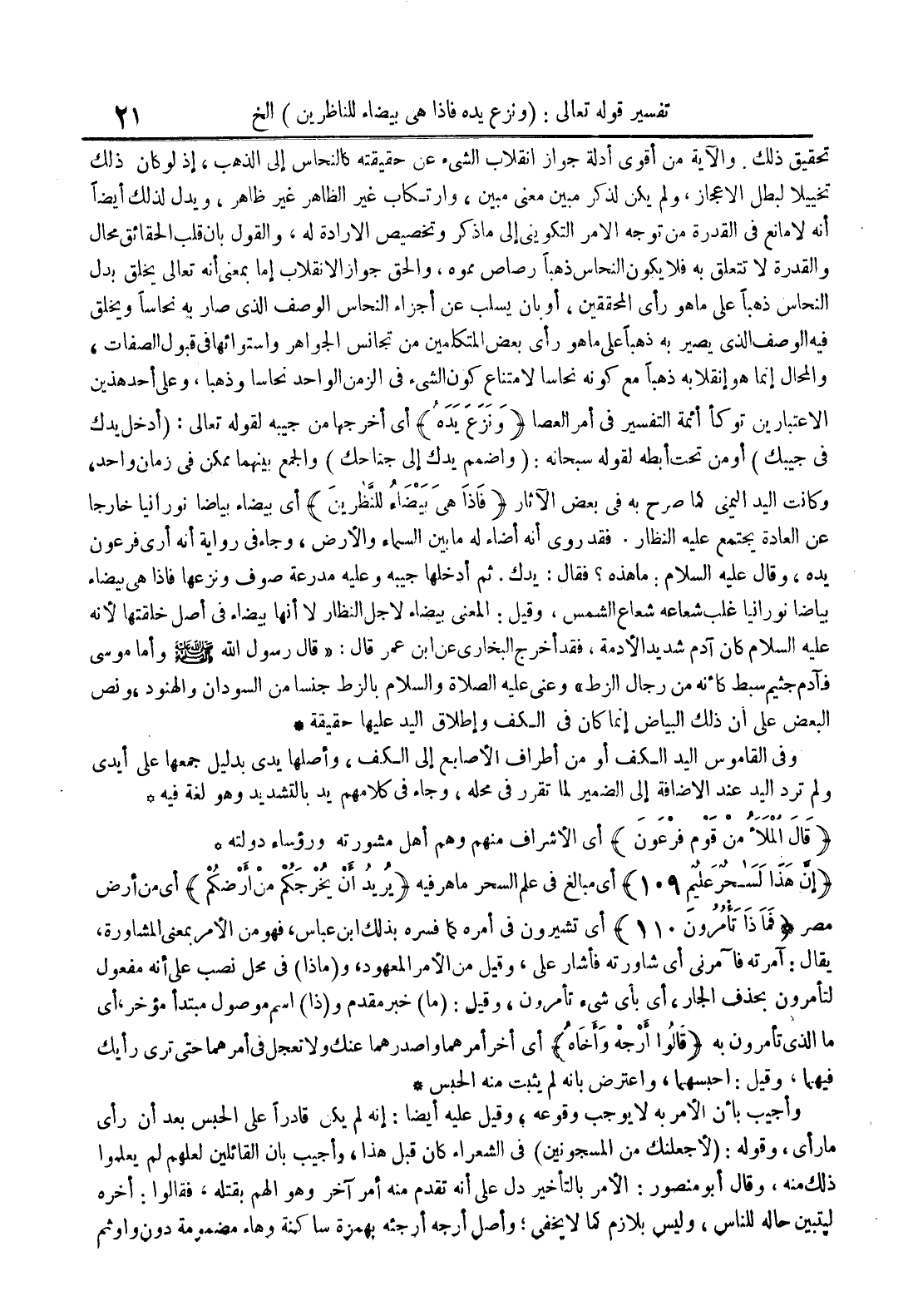 تحقيق ذلك والآية من أقوى أدلة جواز انقلاب الشيء عن حقيقته كالنحاس إلى الذهب إذ لو كان ذلك تخييلا لبطل الإعجاز ولم يكن لذكر مبين معنى مبين وارتكاب غير الظاهر غير ظاهر ويدل لذلك أيضا أنه لامانع في القدرة من توجه الامر التكويني إلى ماذكر وتخصيص الإرادة له والقول بأن قلب الحقائق محال والقدرة لا تتعلق به فلا يكون النحاس ذهبا رصاص مموه والحق جواز الإنقلاب إما بمعنى أنه تعالى يخلق بدل النحاس ذهبا على ماهو رأي المحققين أو بأن يسلب عن أجزاء النحاس الوصف الذي صار به نحاسا ويخلق فيه الوصف الذي يصير به ذهبا على ماهو رأي بعض المتكلمين من تجانس الجواهر واستوائها في قبول الصفات والمحال إنما هو إنقلابه ذهبا مع كونه نحاسا لامتناع كون الشيء في الزمن الواحد نحاسا وذهبا وعلى أحد هذين الإعتبارين توكأ أئمة التفسير في أمر العصا ونزع يده أي أخرجها من جيبه لقوله تعالى : أدخل يدك في جيبك أو من تحت إبطه لقوله سبحانه : واضمم يدك إلى جناحك والجمع بينهما ممكن في زمان واحد وكانت اليد اليمنى كما صرح به في بعض الآثار فإذا هي بيضاء للناظرين أي بيضاء بياضا نورانيا خارجا عن العادة يجتمع عليه النظار فقد روي أنه أضاء له مابين السماء والأرض وجاء في رواية أنه أرى فرعون يده وقال عليه السلام : ماهذه فقال : يدك ثم أدخلها جيبه وعليه مدرعة صوف ونزعها فإذا هي بيضاء بياضا نورانيا غلب شعاعه شعاع الشمس وقيل : المعنى بيضاء لأجل النظار لا أنها بيضاء في أصل خلقتها لأنه عليه السلام كان آدم شديد الأدمة فقد أخرج البخاري عن ابن عمر قال : قال رسول الله صلى الله تعالى عليه وسلم وأما موسى فآدم جثيم سبط كأنه من رجال الزط وعنى عليه الصلاة و السلام بالزط جنسا من السودان والهنود ونص البعض على أن ذلك البياض إنما كان في الكف وإطلاق اليد عليها حقيقة