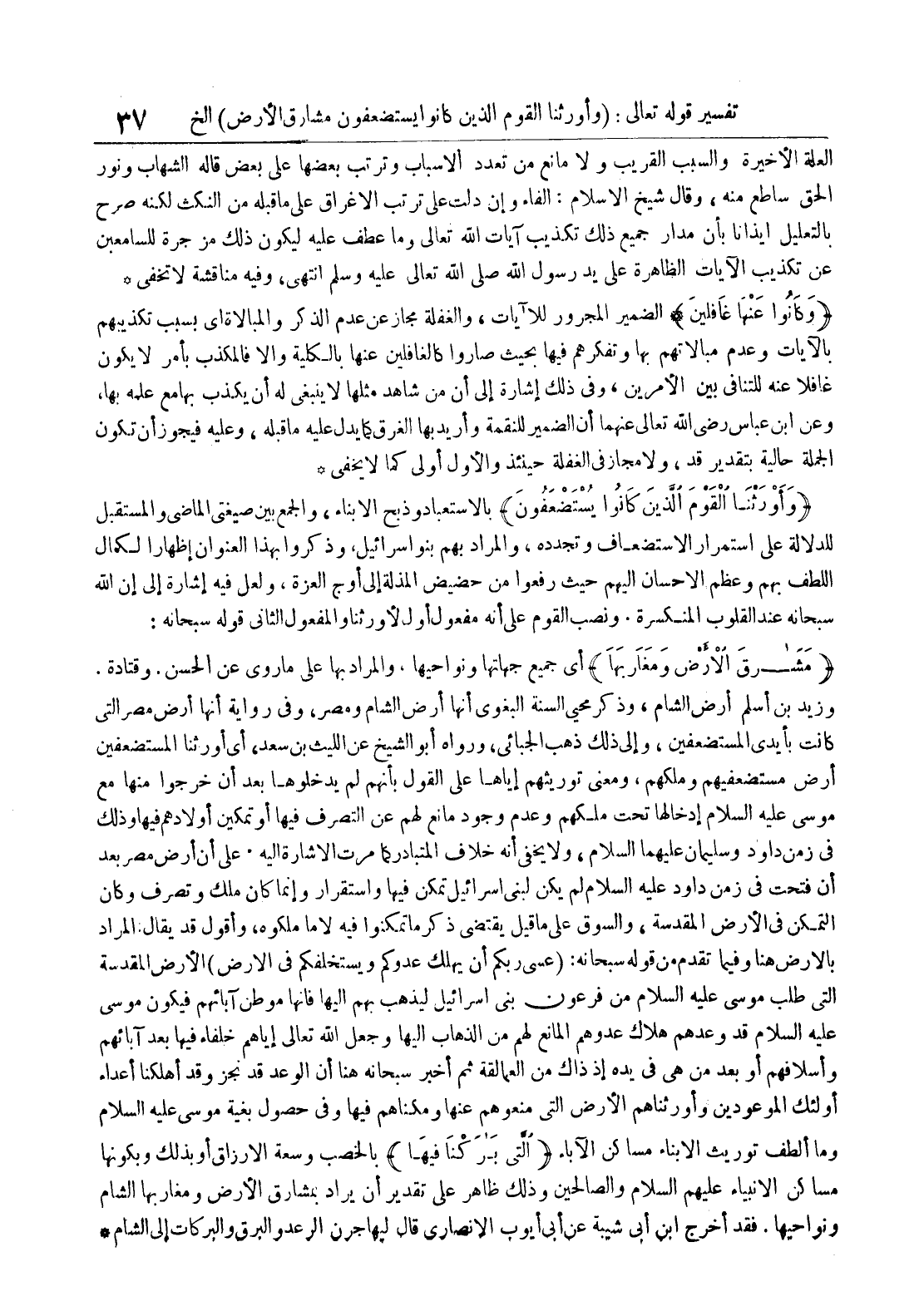 وأورثنا القوم الذين كانوا يستضعفون بالإستعباد وذبح الابناء والجمع بين صيغتي الماضي والمستقبل للدلالة على إستمرار الإستضعاف وتجدده والمراد بهم بنو إسرائيل وذكروا بهذا العنوان إظهارا لكمال اللطف بهم وعظم الإحسان إليهم حيث رفعوا من حضيض المذلة إلى أوج العزة ولعل فيه إشارة إلى أن الله سبحانه عند القلوب المنكسرة ونصب القوم على أنه مفعول أول لأورثنا والمفعول الثاني قوله سبحانه : مشارق الأرض ومغاربها أي جميع جهاتها ونواحيها والمراد بها على ماروي عن الحسن وقتادة وزيد بن أسلم أرض الشام وذكر محيي السنة البغوي أنها أرض الشام ومصر وفي رواية أنها أرض مصر التي كانت بأيدي المستضعفين وإلى ذلك ذهب الجبائي ورواه أبو الشيخ عن الليث بن سعد أي أورثنا المستضعفين أرض مستضعفيهم وملكهم ومعنى توريثهم إياها على القول بأنهم لم يدخلوها بعد أن خرجوا منها مع موسى عليه السلام إدخالها تحت ملكهم وعدم وجود مانع لهم عن التصرف فيها أو تمكين أولادهم فيها وذلك في زمن داود وسليمان عليهما السلام ولا يخفى أنه خلاف المتبادر كما مرت الإشارة إليه على أن أرض مصر بعد أن فتحت في زمن داود عليه السلام لم يكن لبني إسرئيل تمكن فيها واستقرار وإنما كان ملك وتصرف وكان التمكن في الأرض المقدسة والسوق على ماقيل يقتضي ذكر ما تمكنوا فيه لا ماملكوه وأقول قد يقال المراد بالأرض هنا وفيما تقدم من قوله سبحانه : عسى ربكم أن يهلك عدوكم ويستخلفكم في الأرض الأرض المقدسة التي طلب موسى عليه السلام من فرعون بني إسرائيل ليذهب بهم إليها فإنها موطن آبائهم فيكون موسى عليه السلام قد وعدهم هلاك عدوهم المانع لهم من الذهاب إليها وجعل الله تعالى إياهم خلفاء فيها بعد آبائهم وأسلافهم أو بعد من هي في يده إذ ذاك من العمالقة ثم أخبر سبحانه هنا أن الوعد قد نجز وقد أهلكنا أعداء اولئك الموعودين وأورثناهم الأرض التي منعوهم عنها ومكناهم فيها وفي حصول بغية موسى عليه السلام وما ألطف توريث الأبناء مساكن الآباء التي باركنا فيها بالخصب وسعة الأرزاق أو بذلك وبكونها مساكن الأنبياء عليهم السلام والصالحين وذلك ظاهر على تقدير أن يراد بمشارق الأرض ومغاربها الشام ونواحيها فقد أخرج ابن أبي شيبة عن أبي أيوب الأنصاري قال ليهاجرن الرعد والبرق والبركات إلى الشام