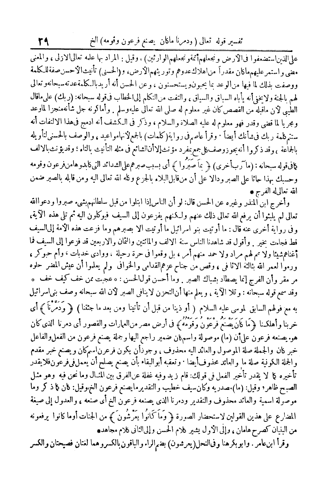 وأخرج ابن المنذر وغيره عن الحسن قال : لو أن الناس إذا ابتلوا من قبل سلطانهم بشيء صبروا ودعوا الله تعالى لم يلبثوا أن يرفع الله تعالى ذلك عنهم ولكنهم يفزعون إلى السيف فيوكلون إليه ثم تلى هذه الآية وفي رواية أخرى عنه قال : ما أوتيت بنو إسرائيل ما أوتيت إلا بصبرهم وما فزعت هذه الأمة إلى السيف قط فجاءت بخير وأقول قد شاهدنا الناس سنة الألف والمائتين والثمان والأربعين قد فزعوا إلى السيف فما أغناهم شيئا ولا تم لهم مراد ولا حمد منهم أمر بل وقعوا في حرة رحيلة ووادي خدبات وأم حبوكر ورموا لعمر الله بثالثة الأثا في وقص من جناح عزهم القدامى والخوافي ولم يعلموا أن عيش المضر حلوه مر مقر وأن الفرج إنما يصطاد بشباك الصبر وما أحسن قول الحسن :