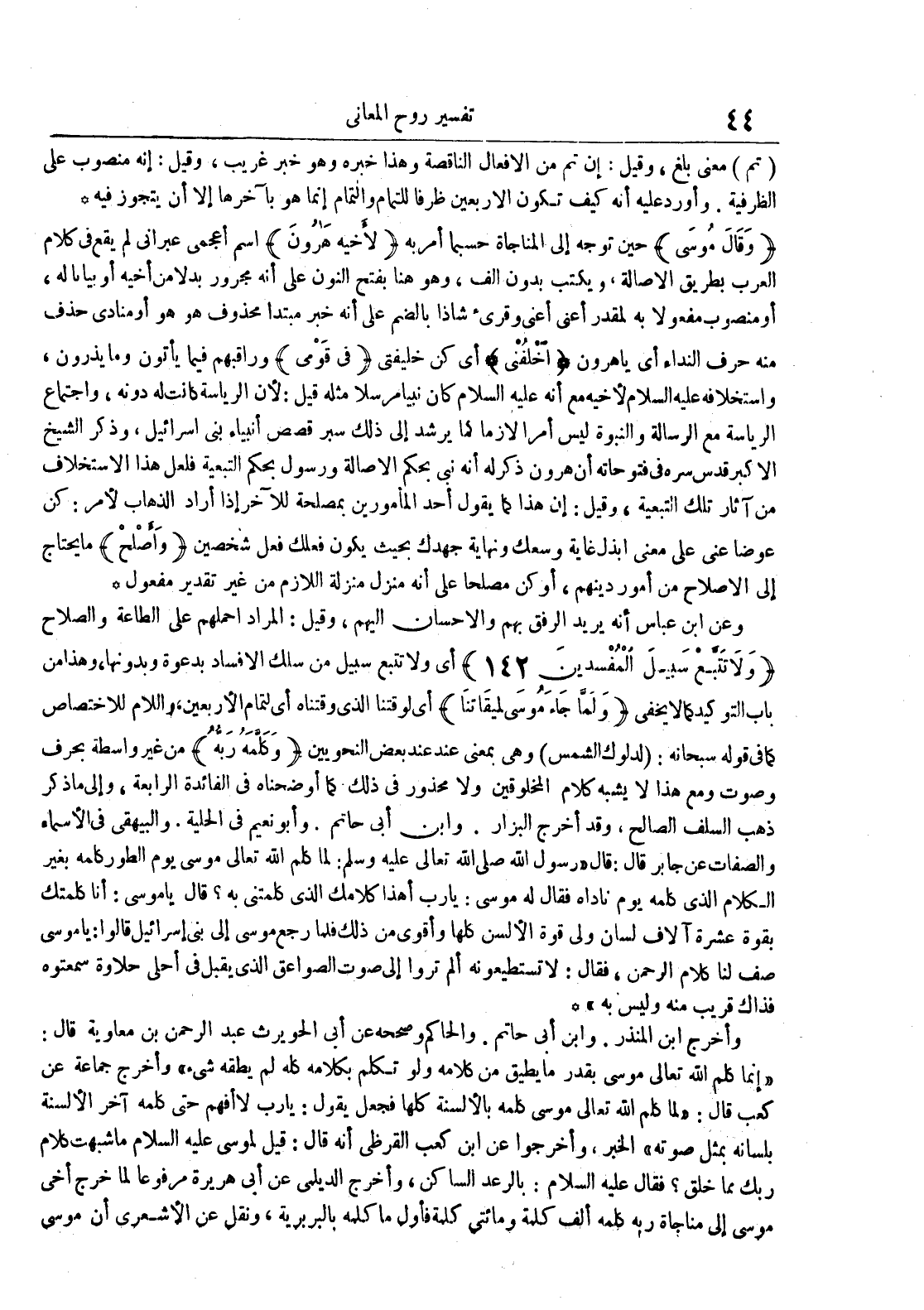 وقال موسى حين توجه إلى المناجاة حسبما أمر به لأخيه هارون اسم أعجمي عبراني لم يقع في كلام العرب بطريق الأصالة ويكتب بدون ألف وهو هنا بفتح النون على أنه مجرور بدلا من أخيه أو بيانا له أو منصوب مفعولا به لمقدر أعني أعني وقريء شاذا بالضم على أنه خبر مبتدأ محذوف هو هو أو منادى حذف منه حرف النداء أي ياهرون اخلفني أي كن خليفتي في قومي وراقبهم فيما يأتون وما يذرون واستخلافه عليه السلام لأخيه مع أنه عليه السلام كان نبيا مرسلا مثله قيل : لأن الرياسة كانت له دونه واجتماع الرياسة مع الرسالة والنبوة ليس أمرا لازما كما يرشد إلى ذلك سير قصص أنبياء بني إسرئيل وذكر الشيخ الأكبر قدس سره في فتوحاته أن هرون ذكر له أنه نبي بحكم الأصالة ورسول بحكم التبعية فلعل هذا الإستخلاف من آثار تلك التبعية وقيل : إن هذا كما يقول أحد المأمورين بمصلحة للآخر إذا أراد الذهاب لأمر : كن عوضا عني على معنى ابذل غاية وسعك ونهاية جهدك بحيث يكون فعلك فعل شخصين وأصلح مايحتاج إلى الإصلاح من أمور دينهم أو كن مصلحا على أنه منزل منزلة اللأزم من غير تقدير مفعول